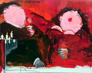 Fraai origineel werk van Gerdine Duijsens. De kunstenares vervaardigde het werk in 2014 gebruikmakend van een mooie mix van gemengde technieken, acryl, marker, penseel, kwast, spatel: het resultaat is een vlotte, vrije, maar trefzekere schilderstijl die in combinatie met de voor haar zo kenmerkende vrolijke figuratie wederom zorgt voor de nodige glimlach bij de aanschouwer.