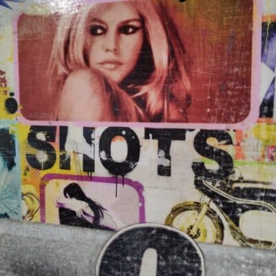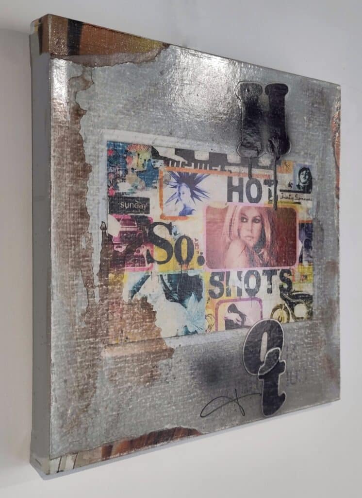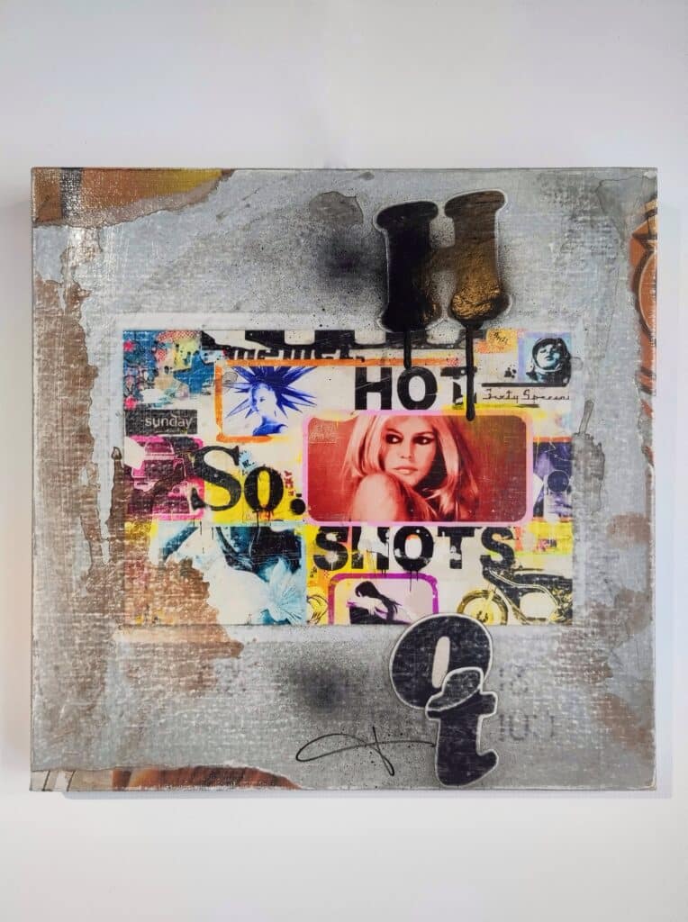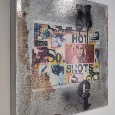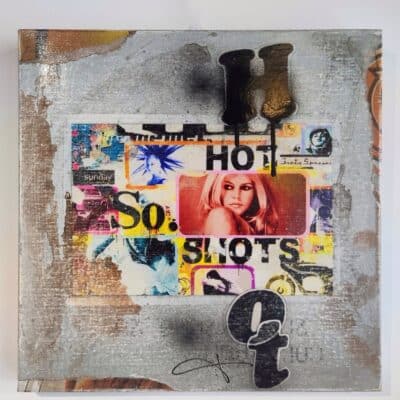 Fraaie handvervaardigde monotype op linnen van Jörg Döring. De monotype is 1 van een serie kleinere werken (40x40cm), door de kunstenaar opgebouwd uit fraaie heldere kleuren gecombineerd met foto’s, ruw geschilderde oppervlaktes, typografie en geschreven teksten.. De serie van kleine monotypes zijn in een volledig met de hand vervaardigde oplage van 49 stuks vervaardigd waarbij elk stuk volledig uniek is.