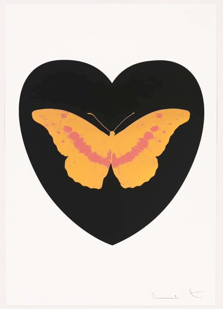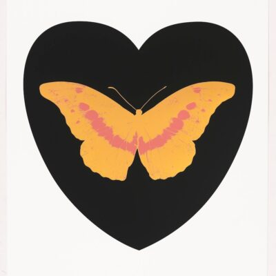De eigentijdse pop-art ‘I Love You – black, cool gold, loganberry foil block Butterfly’ is een van de veertien vlinders binnen de gelimiteerde release van Damien Hirst ter ere van Valentijnsdag (2015). Hirst’s iconische vlindermotief, geassocieerd met liefde, exquise schoonheid, hoop, spiritualiteit en dood is in deze recente serie gecombineerd met strak vormgegeven harten. Door de foil block techniek kent elk werk een uitzonderlijk spel tussen detail, figuratie en ‘metallic’ folie-accenten.