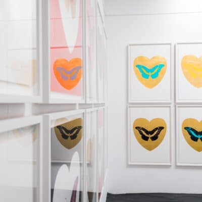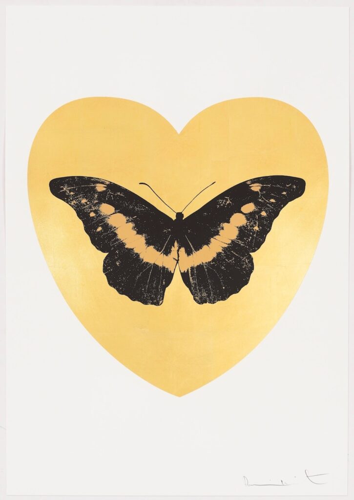 De eigentijdse pop-art ‘I Love You – gold leaf, black, cool gold foil block Butterfly’ is een van de veertien vlinders binnen de gelimiteerde release van Damien Hirst ter ere van Valentijnsdag (2015). Hirst’s iconische vlindermotief, geassocieerd met liefde, exquise schoonheid, hoop, spiritualiteit en dood is in deze recente serie gecombineerd met strak vormgegeven harten. Door de foil block techniek kent elk werk een uitzonderlijk spel tussen detail, figuratie en ‘metallic’ folie-accenten.