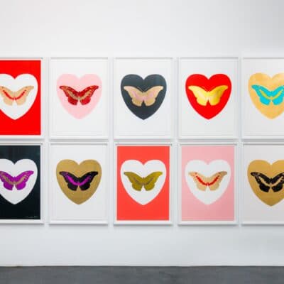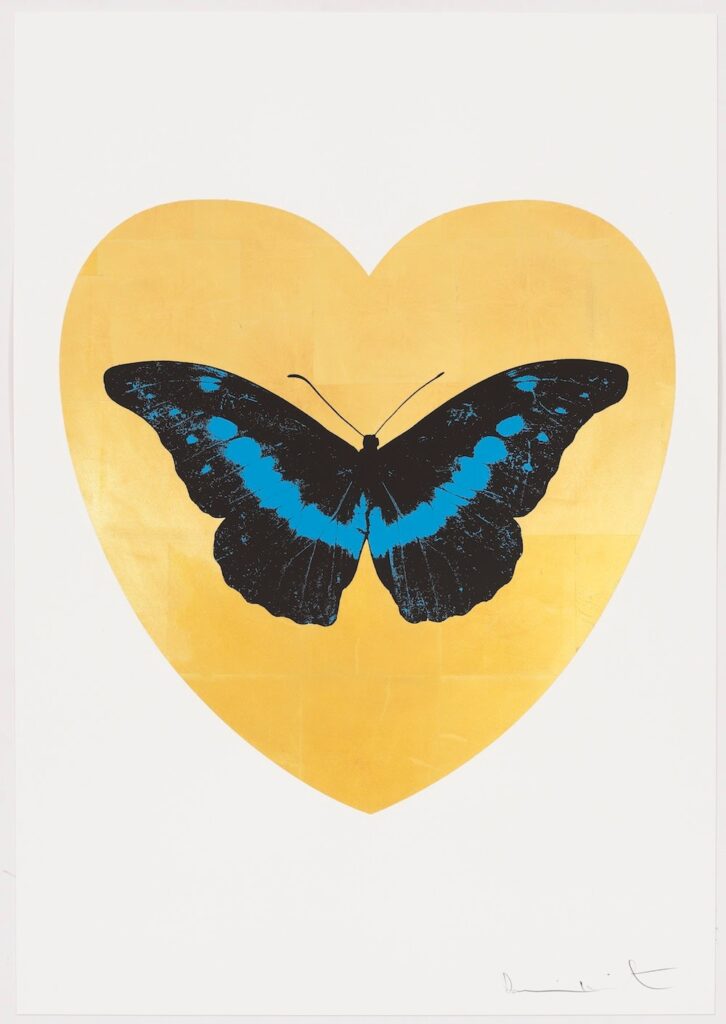 De eigentijdse pop-art ‘I Love You – gold leaf, black, turquoise foil block Butterfly’ is een van de veertien vlinders binnen de gelimiteerde release van Damien Hirst ter ere van Valentijnsdag (2015). Hirst’s iconische vlindermotief, geassocieerd met liefde, exquise schoonheid, hoop, spiritualiteit en dood is in deze recente serie gecombineerd met strak vormgegeven harten. Door de foil block techniek kent elk werk een uitzonderlijk spel tussen detail, figuratie en ‘metallic’ folie-accenten.