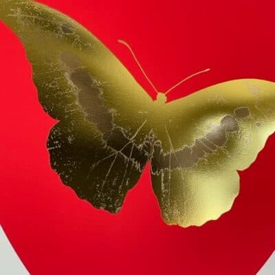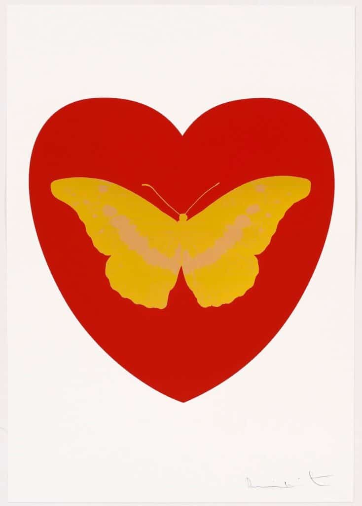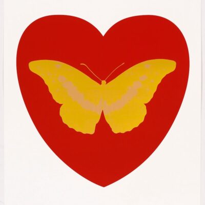 De eigentijdse pop-art ‘I Love You – red, oriental gold, cool gold foil block Butterfly’ is een van de veertien vlinders binnen de gelimiteerde release van Damien Hirst ter ere van Valentijnsdag (2015). Hirst’s iconische vlindermotief, geassocieerd met liefde, exquise schoonheid, hoop, spiritualiteit en dood is in deze recente serie gecombineerd met strak vormgegeven harten. Door de foil block techniek kent elk werk een uitzonderlijk spel tussen detail, figuratie en ‘metallic’ folie-accenten.