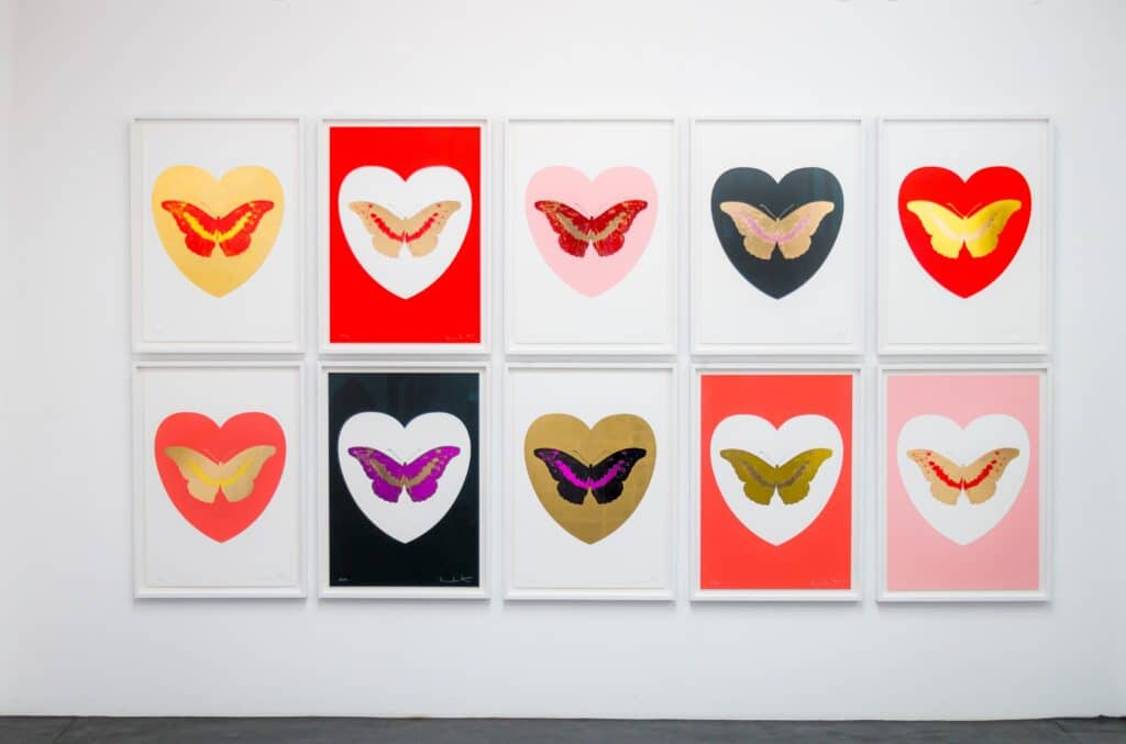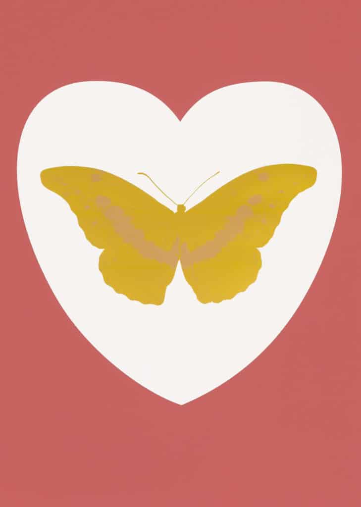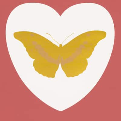De eigentijdse pop-art ‘I Love You – white, coral, oriental gold, cool gold foil block Butterfly’ is een van de veertien vlinders binnen de gelimiteerde release van Damien Hirst ter ere van Valentijnsdag (2015). Hirst’s iconische vlindermotief, geassocieerd met liefde, exquise schoonheid, hoop, spiritualiteit en dood is in deze recente serie gecombineerd met strak vormgegeven harten. Door de foil block techniek kent elk werk een uitzonderlijk spel tussen detail, figuratie en ‘metallic’ folie-accenten.