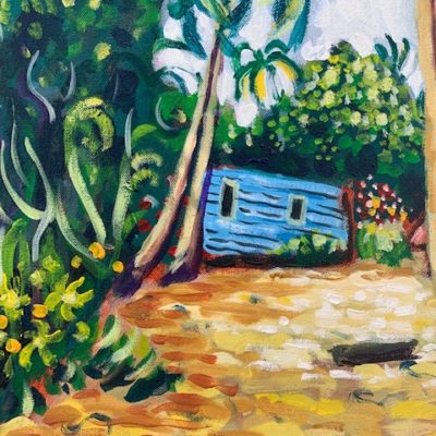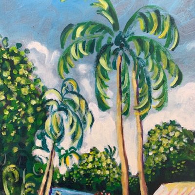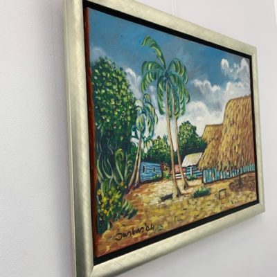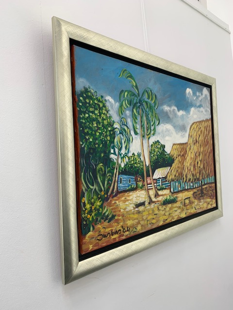 Prachtig uniek werk uit 2004 van Justus Donker. Op zijn reis door Paramaribo en Suriname maakte de kunstenaar een aantal schitterende werken. Dit werk is ingelijst in een handgemaakte zilverkleurige baklijst.