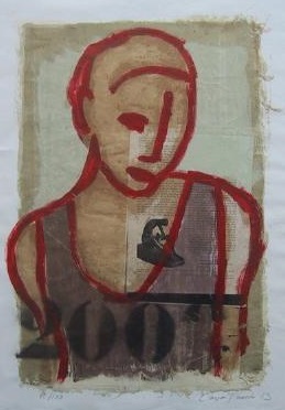 Bijzondere uniekdruk van Casper Faassen getiteld “Inocente” uit 2003. De zeefdruk is door de kunstenaar geproduceerd op fraai, handgeschept Thaïs- en Indisch papier, waarbij elk blad met de hand voorbewerkt is met krantenknipsels, foto’s, tekeningen en paintbrush. Over deze collages heen is door Casper de zeefdruk geproduceerd waardoor niet 1 zeefdruk hetzelfde is.