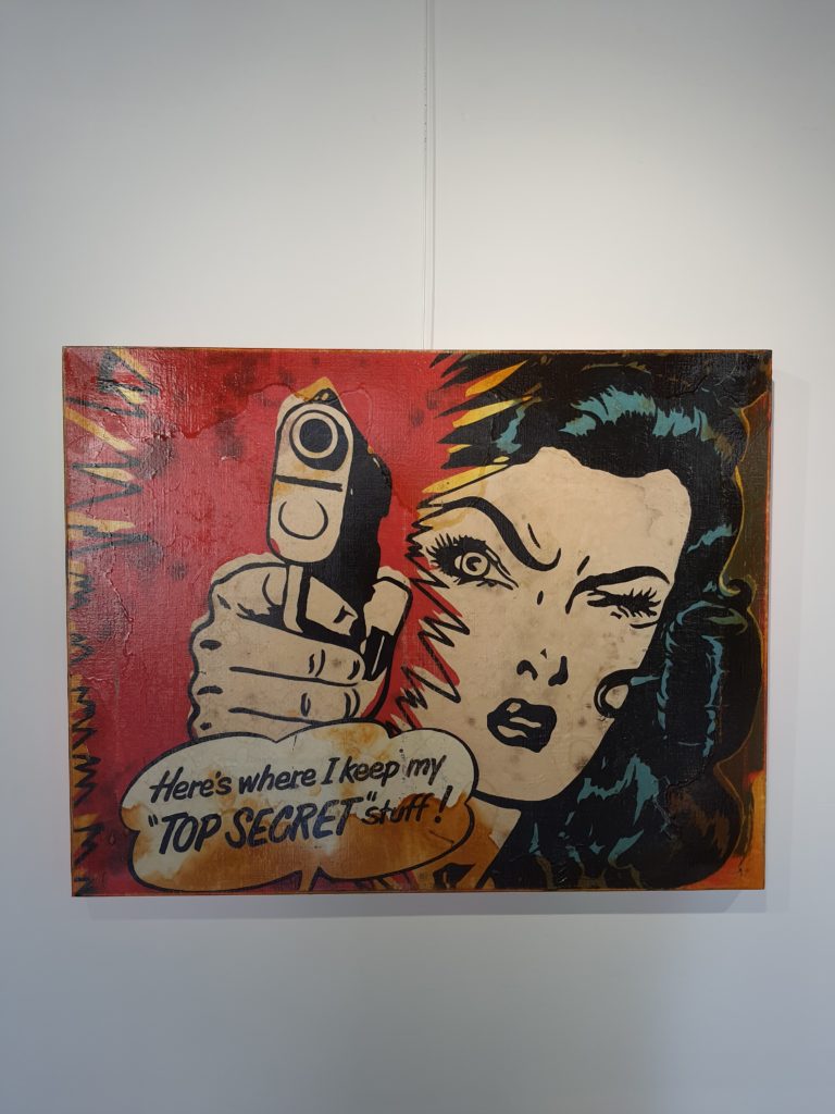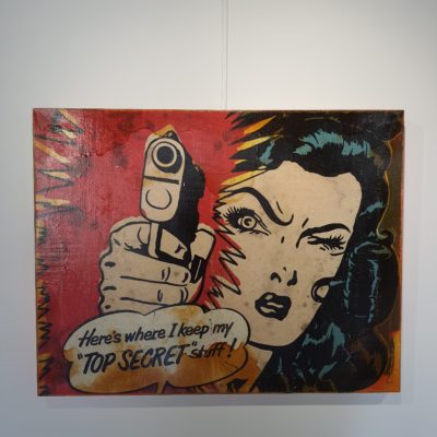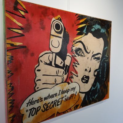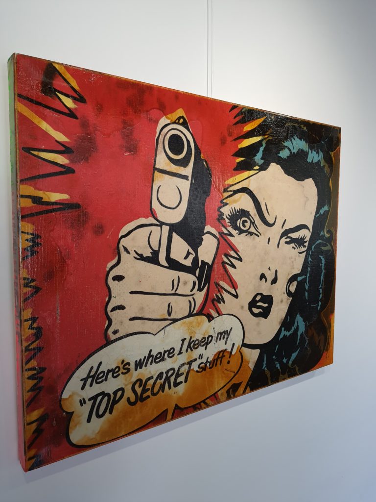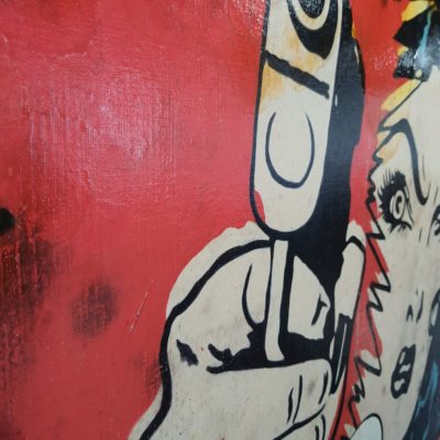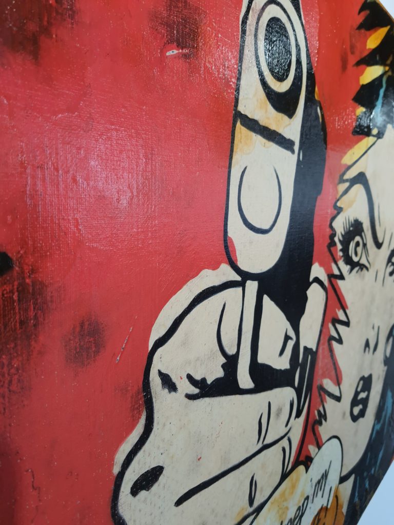 Origineel olieverf werk van Jörg Döring uit 2017. Het stuk is met gemengde technieken vervaardigd met een combinatie van achtergrond collages van originele fotoafdrukken en ruw met olieverf geschilderde oppervlaktes. Het stuk is vervolgens door de kunstenaar met olieverf met een stevige knipoog naar de Popart uit de jaren 60 geschilderd met een krachtig en intrigerend resultaat als gevolg. Jorg Doring toont ook weer met deze laatste stukken dat hij met recht tot Duitslands meest vooraanstaande neo-PopArt kunstenaars wordt mag worden gerekend! Het stuk is vervaardigd op een stevig dubbeldik frame en doorgeschilderd op de zijkanten.