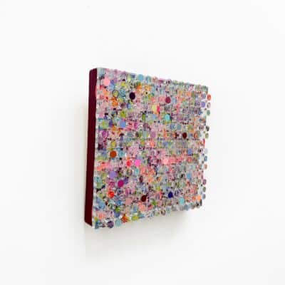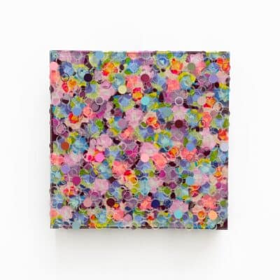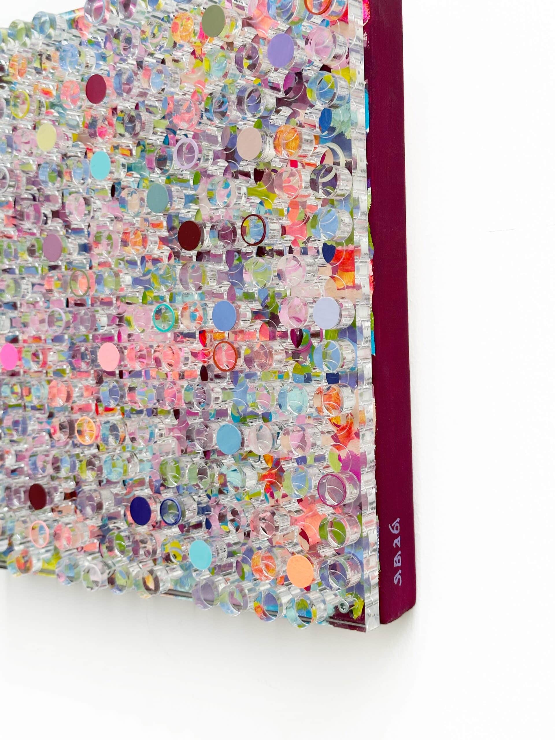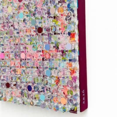 Joy Spark, Silvia Strobos. Acryl op doek, afgewerkt met een laser-gesneden plexiglas laag waarvan de uitgesneden elementen deels beschilderd en verhoogd zijn teruggeplaatst. Een sprankelend palet van frisse kleuren en zachte tinten vormt een levendig, speels geheel. De transparante cirkels creëren diepte en ritme, waardoor het werk een energieke en vrolijke uitstraling krijgt die elke ruimte laat oplichten.