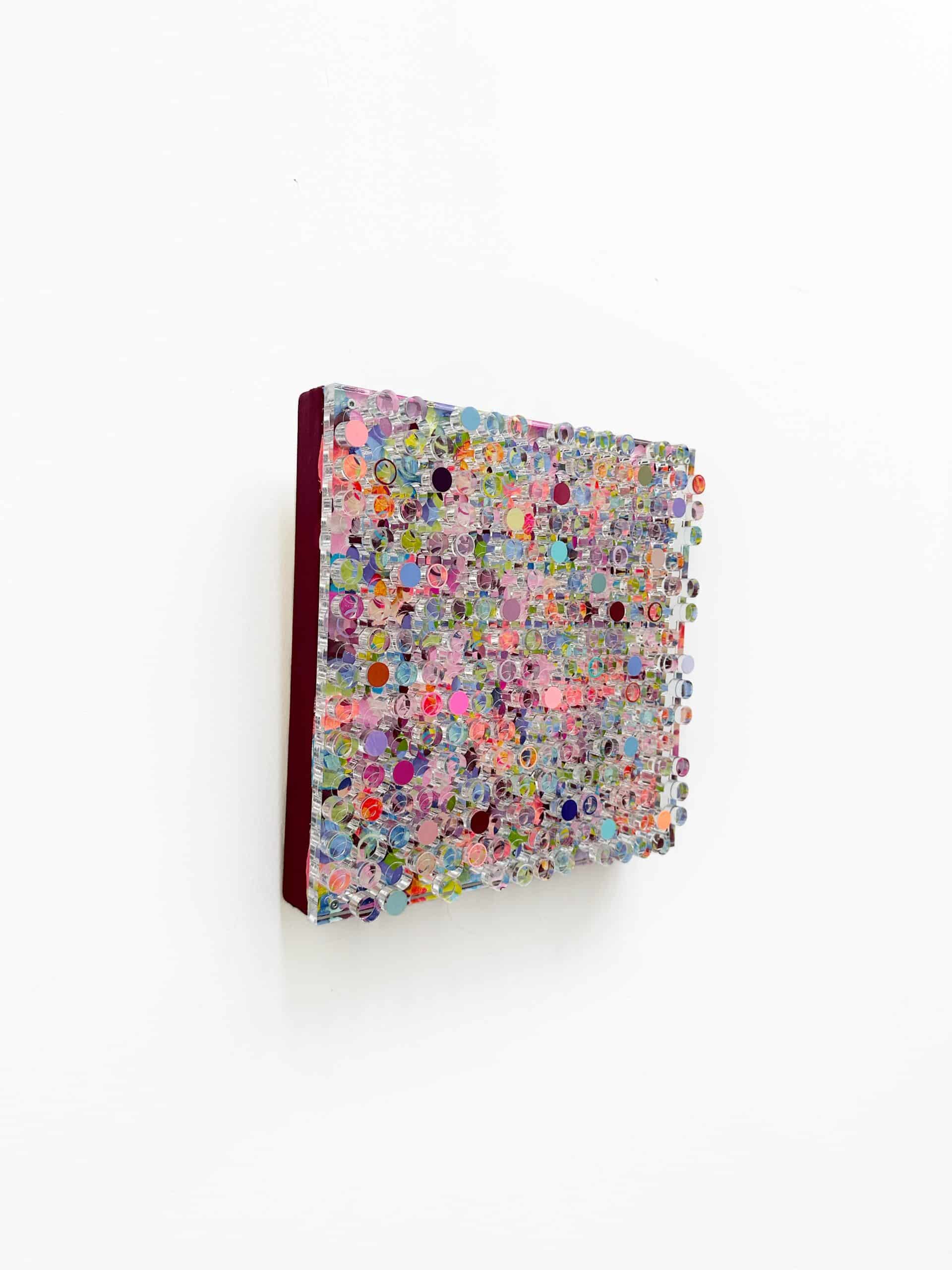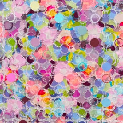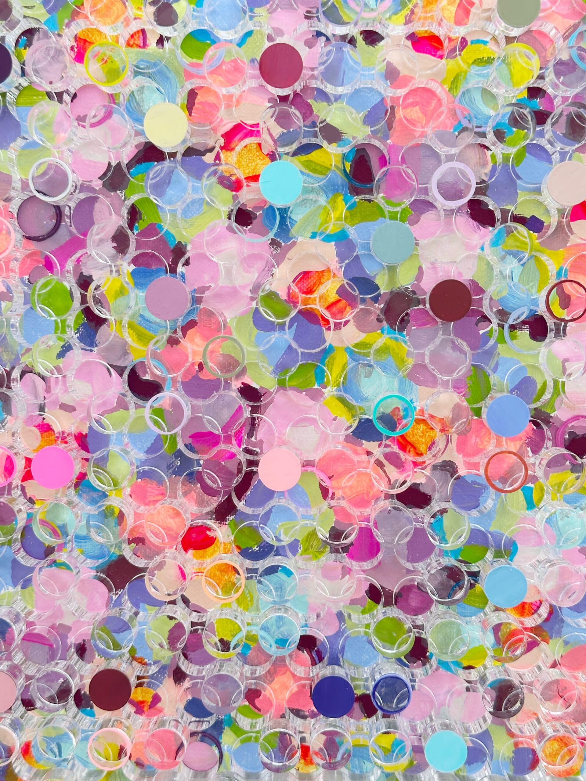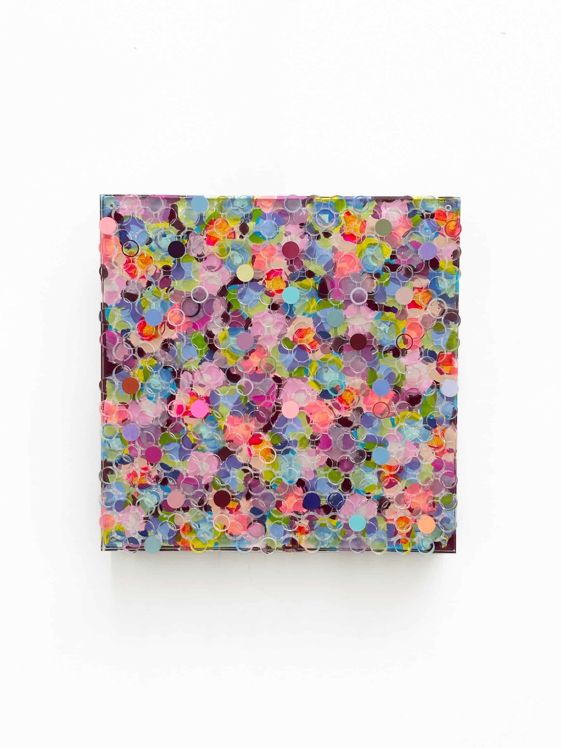Joy Spark, Silvia Strobos. Acrylic on canvas, finished with a laser-cut plexiglass layer, with cut-out elements partly painted and reattached in relief. A sparkling palette of fresh and soft colors forms a lively, playful composition. The transparent circles create depth and rhythm, giving the piece an energetic, joyful presence that brightens any space.