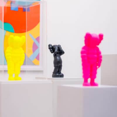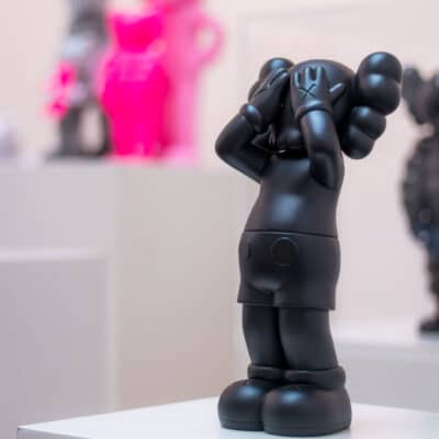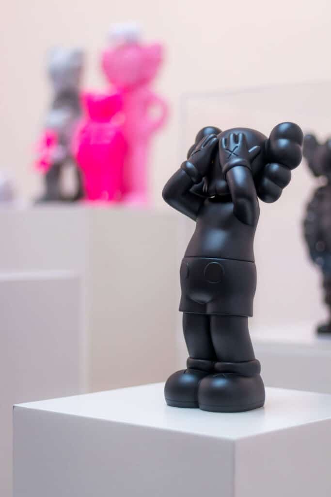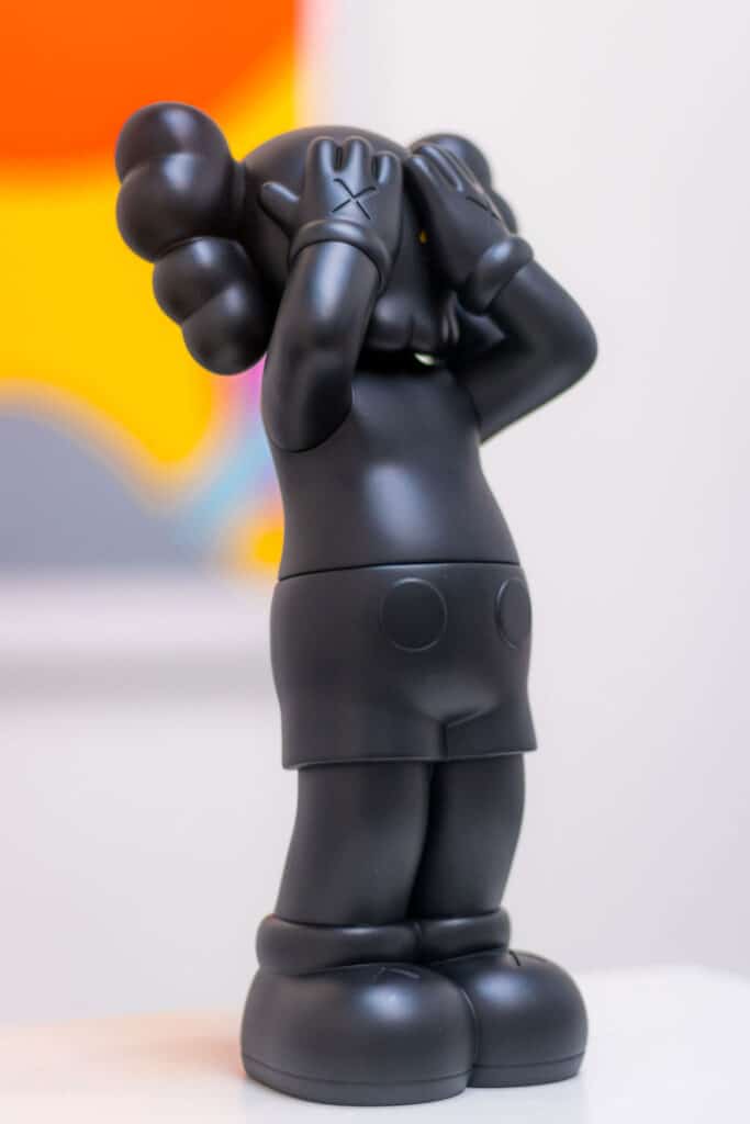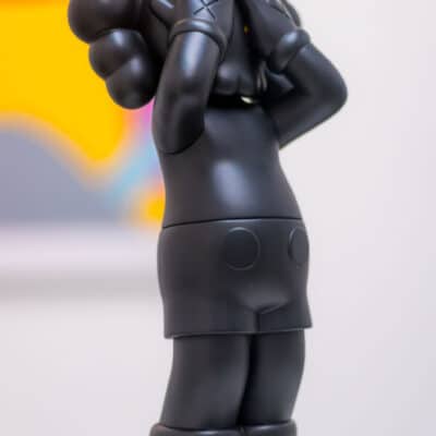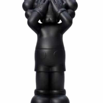 KAWS Holiday UK vinyl figure was newly designed to go alongside his hot air balloon world tour in 2021. This sculptural piece — one of the world’s largest hot air balloons at 42 meters tall — reimagines the artist’s signature work, COMPANION, in larger-than-life proportions. This UK Holiday Vinyl Companion accompanies KAWS his unique flying creation in an all black edition.