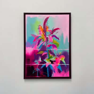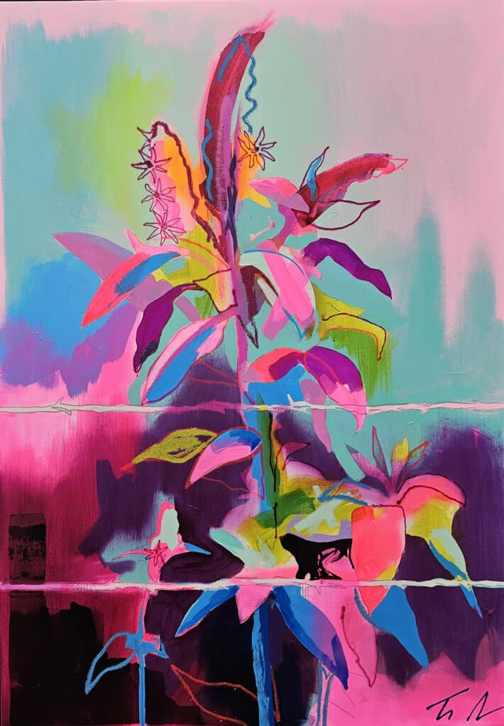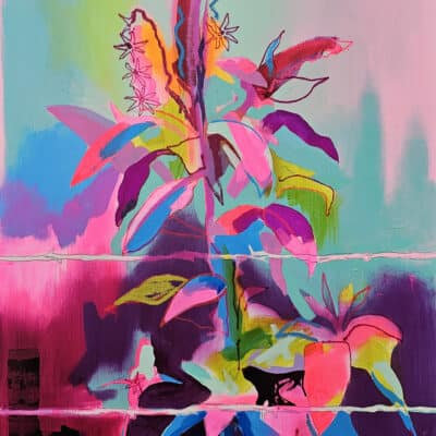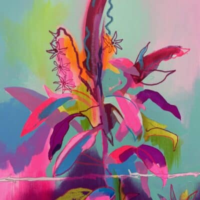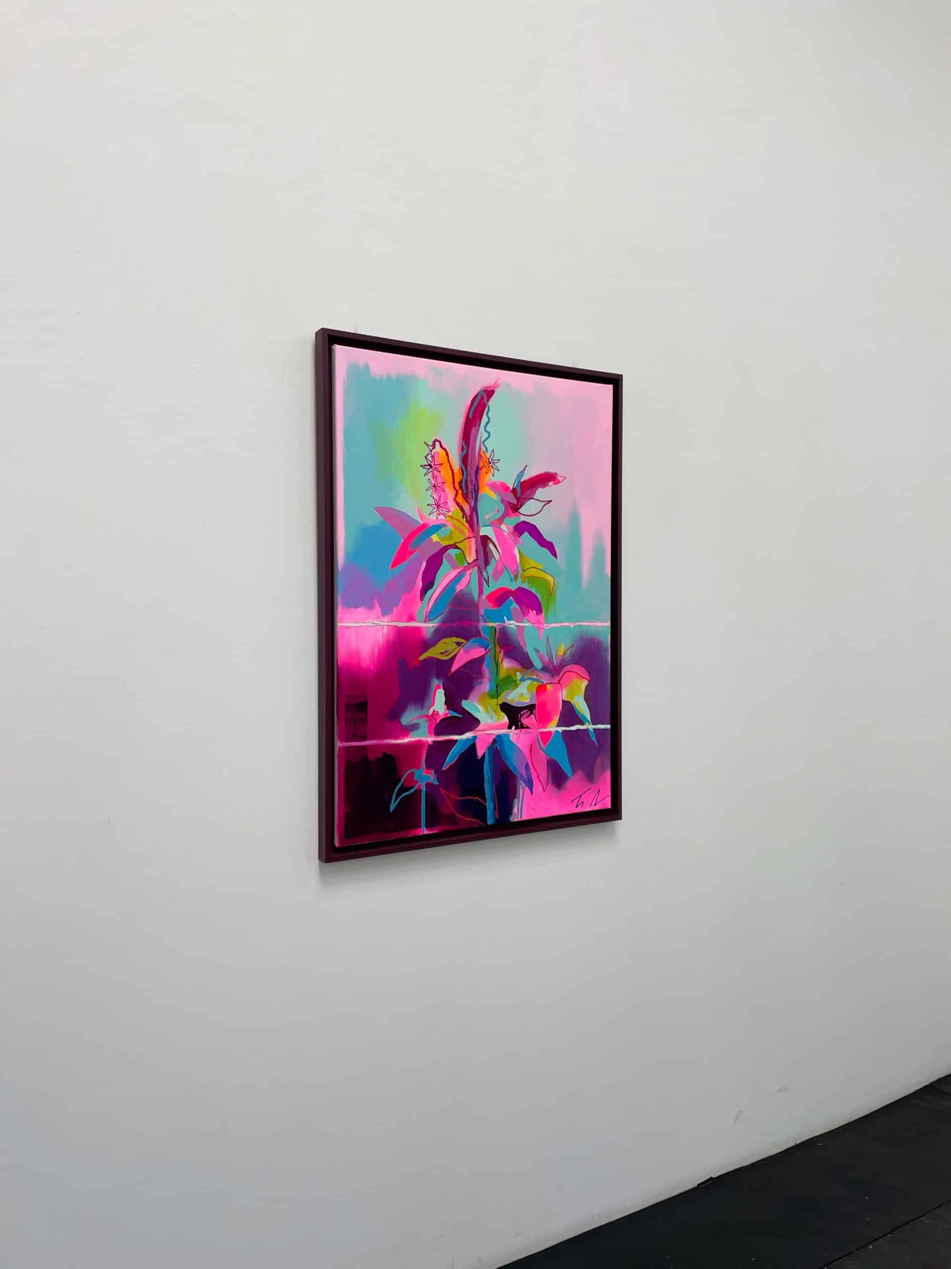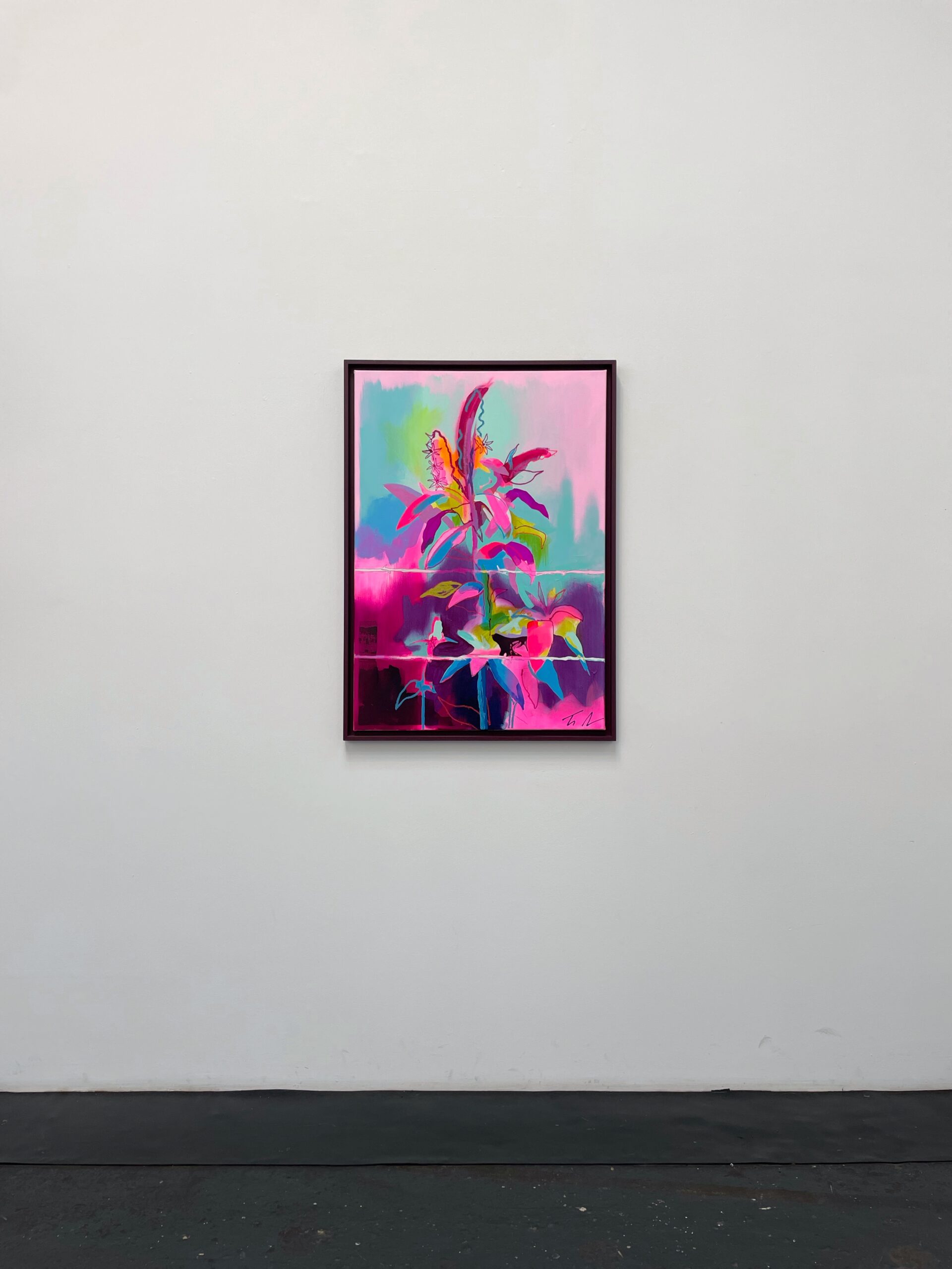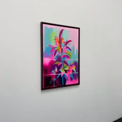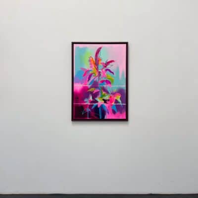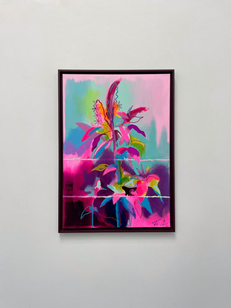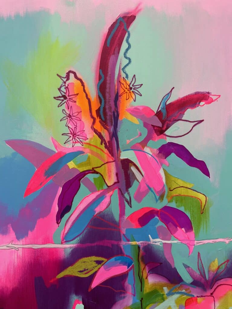 Fowler takes inspiration from exotic and migratory plants reflecting his own DNA, from west Africa, via the Caribbean to the UK. He subverts traditional and contemporary methods of applying oil, acrylic, spray, enamel and graffiti inks using brushes, different aperture caps and marker paint mops to orchestrate purposeful marks, strokes, drips, scrapes and smears across the canvas whilst constructing his exciting and dynamic artworks.