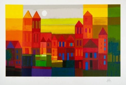 Fraaie zeefdruk van Ton Schulten getiteld ‘Kleurrijke stad’. Het werk is prachtig warm en zonnig van kleur en is zoals we gewend zijn van Schulten met fraaie dikke zeefdruklagen opgebouwd. De zeefdruk is in een oplage van 180 stuks vervaardigd en het werk is ingelijst in een mooie bijpassende handgemaakte zilverkleurige lijst en voorzien van een zuurvrij passe-partout.