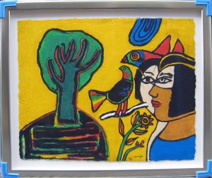 1 van 2 uitzonderlijk mooie Carborundumlitho’s die Corneille in het voorjaar van 2009 vervaardigde in Parijs. Het is voor het eerst dat Corneille met deze volledig met de hand vervaardigde techniek werk heeft gemaakt en het resultaat is verbluffend mooi! De stukken zijn gemaakt in 1 van de meest gerenommeerde studio’s van Parijs, zijn prachtig groot van formaat en zeer fraai van kleur, figuratie en reliëf. Voor het vervaardigen van de stukken gebruikte Corneille maar liefst 1000(!) grams handgeschept papier, wat het werk een bijzondere extra dimensie geeft. De stukken zijn ingelijst in exclusieve handgemaakte zilverkleurige virtrine lijsten voorzien van Museum glas.