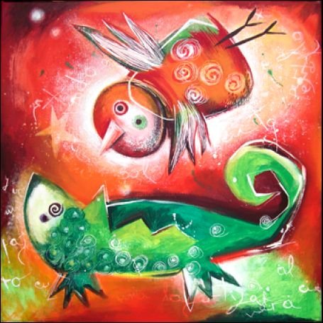Prachtig origineel werk op linnen van Angeles Nieto. Het stuk is 1 van 2 werken van 70x70cm in 2006 door de kunstenares vervaardigd met acryl en inkten op een canvas doek. De werken zijn weer prachtig van kleur en thematiek en ook met deze stukken weet de kunstenares weer een glimlach op het gezicht van de toeschouwer te brengen!