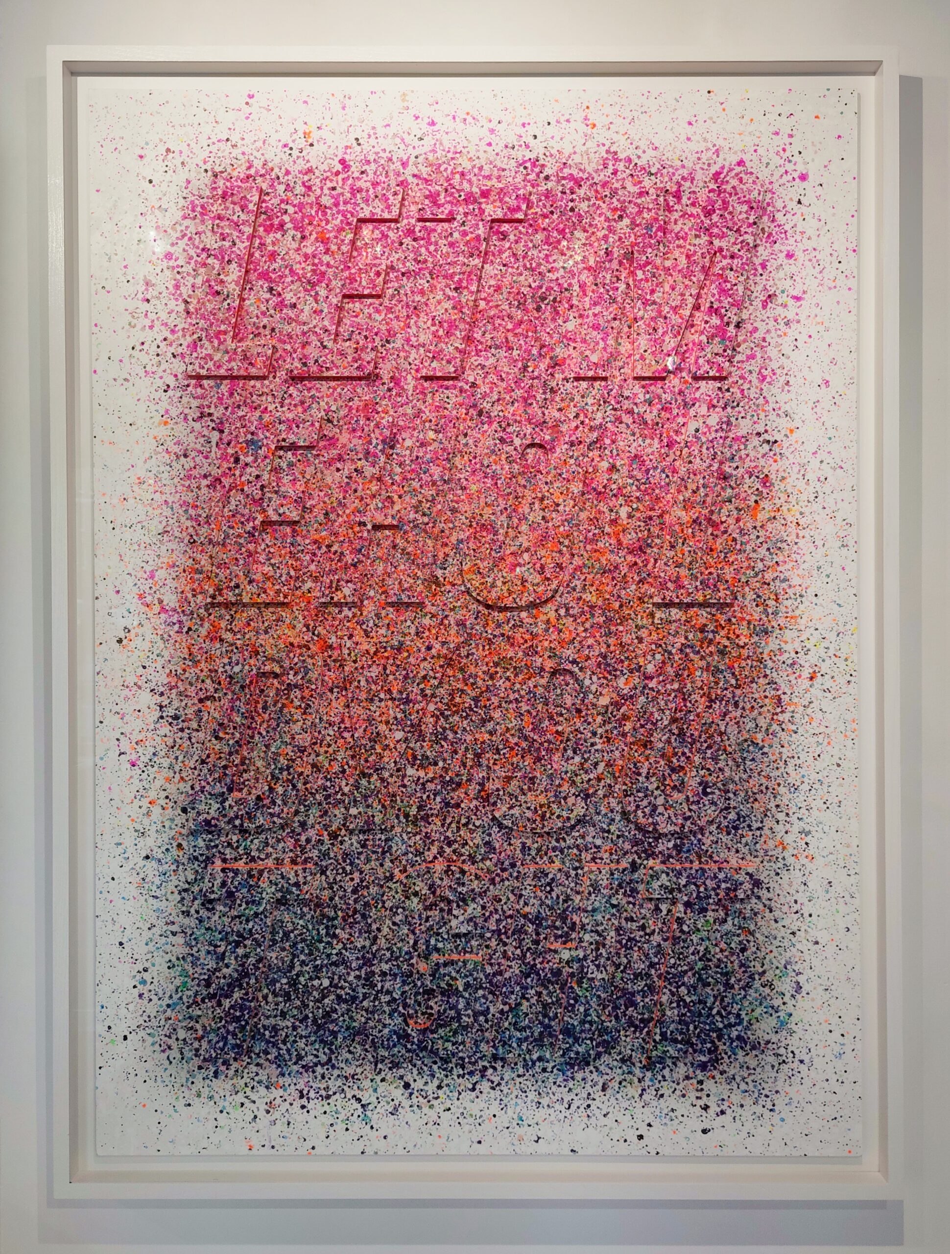 For his exhibition ‘Beyond Words’ Paco Raphael embarked on a journey exploring the limitless possibilities of typography as a standalone art form. The result is a visual symphony, where he orchestrated paint splashes and droplets into carefully crafted patterns. Each stroke and drop thoughtfully placed, giving life to a unique and mesmerizing fusion of colors and shapes. This innovative approach reimagines typography, offering an experience that transcends words.