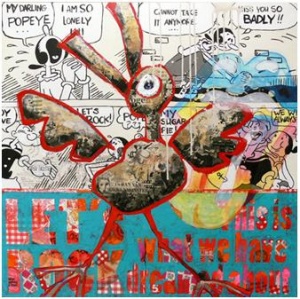 1 van 4 fraaie nieuwe werken van Willemien Brand, vervaardigd in het najaar van 2010. “Let’s rock” is 1 van een serie werken waarin de kunstenares een mix van gemengde technieken, collages, paintbrush, epoxy, laat samensmelten tot een spannend en dynamisch eindresultaat met nog wel de kenmerkende vrolijke en ontwapende knipoog waar Willemien Brand zo bekend om staat.