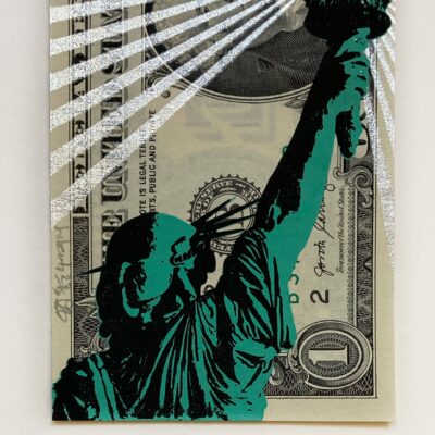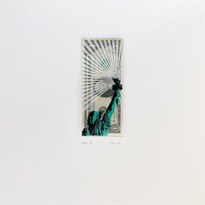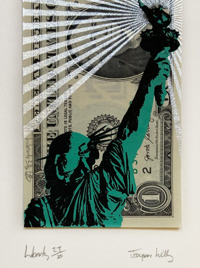 Het werk van de hedendaagse kunstenaar Jayson Lilley (1972) staat bekend om zijn stadse en architectonische focus, waarbij hij de nadruk legt op bekende stadsgezichten van onder andere New York, in dit geval het Vrijheidsbeeld. Hij combineert een unieke zeefdruktechniek met schilderkunst en collagetechnieken, resulterend in bruisende scenes die versterkt worden door het gebruik van bijzondere kleuren en bladgoud of -koper.