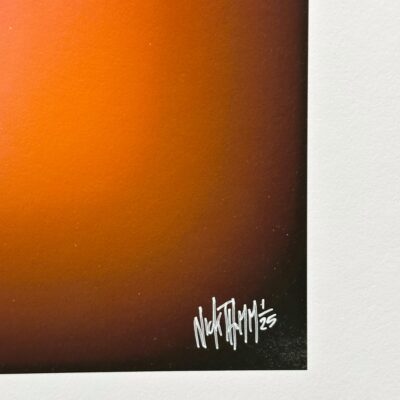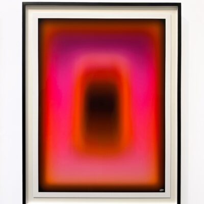 Fine art pigmentprint op hoogwaardig papier, opgebouwd uit digitale kleurverlopen en gelaagde belichtingstechniek. Warme oranje en rozetinten gloeien rond een donkere kern en creëren een krachtig kleurcontrast. Het werk straalt intensiteit en dynamiek uit. Als onderdeel van de speciale editie vormt het solo of in set een energiek accent dat elke ruimte karakter geeft.