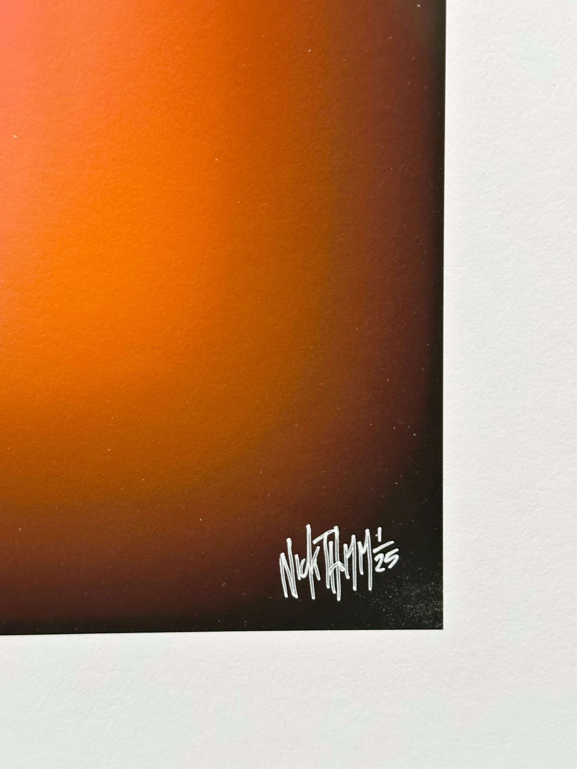 Fine art pigmentprint op hoogwaardig papier, opgebouwd uit digitale kleurverlopen en gelaagde belichtingstechniek. Warme oranje en rozetinten gloeien rond een donkere kern en creëren een krachtig kleurcontrast. Het werk straalt intensiteit en dynamiek uit. Als onderdeel van de speciale editie vormt het solo of in set een energiek accent dat elke ruimte karakter geeft.