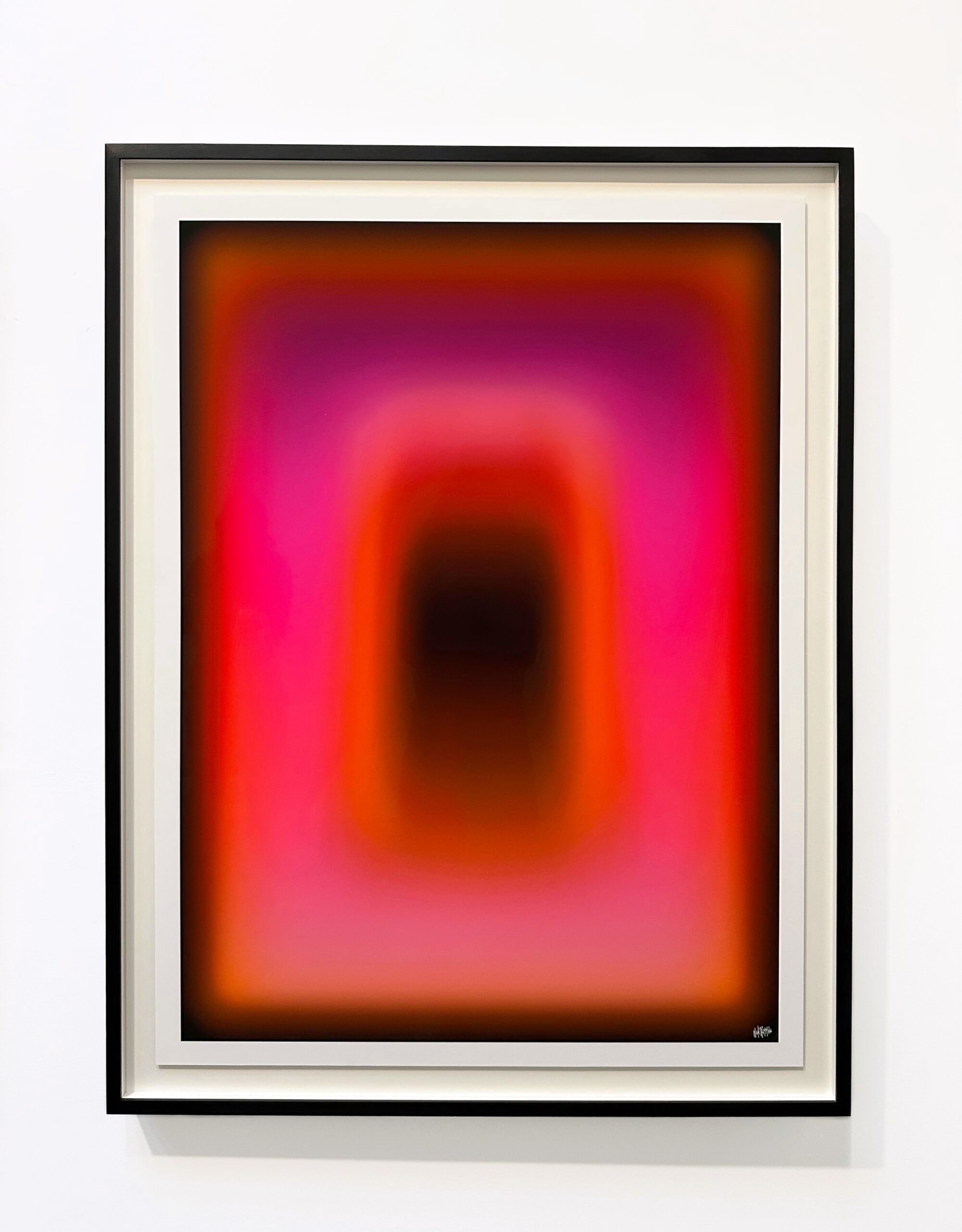 Fine art pigment print on premium paper, created through layered digital gradients and refined light exposure techniques. Warm orange and rose tones glow around a dark core, creating bold contrast. The piece radiates intensity and movement. As part of the special edition, it stands alone or forms a vibrant accent within a set, bringing character to any space.
