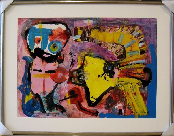 Prachtig origineel werk van de helaas veel te vroeg overleden kunstenaar Jan te Wierik. Het stuk is uit 1992 en vervaardigd met een mix van olieverf, acrylaten, pigmenten en lakacryl op stevig kartonpapier. Door de unieke opbouw van zijn werk wist de kunstenaar de meest bijzondere effecten in zijn werk te krijgen. Jan te Wierik is de grote regisseur in een fantasiewereld temidden van een circusachtig theater van fabeldieren en ondefinieerbare personages die soms in een onheilspellend decor, dan weer sprookjesachtig afgebeeld of met een humoristische inslag een overweldigende indruk op de kijker achterlaten. Het werk is ingelijst in een mooie bijpassende handgemaakte zilverkleurige lijst en voorzien van museumglas (waardoor het glas eigenlijk niet meer zichtbaar is).