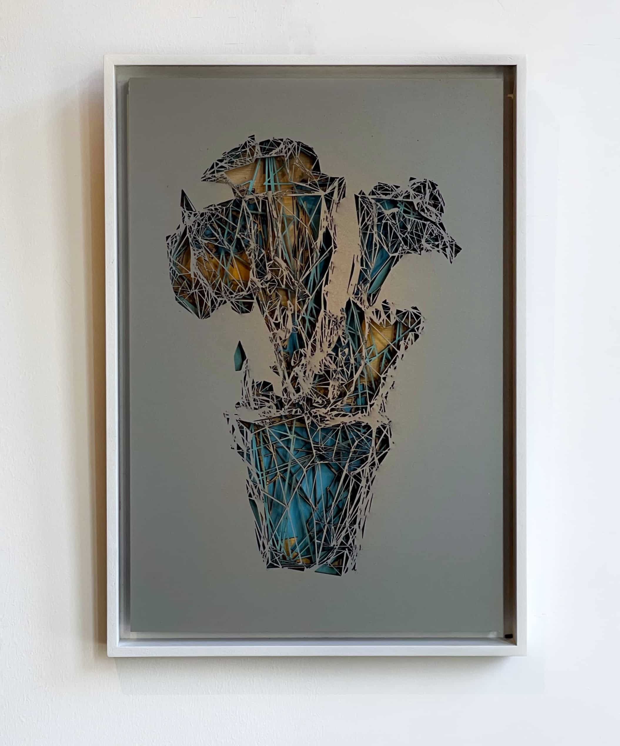 De kunstwerken zijn gelaagd opgebouwd uit een compositie met handbeschilderde, laser gesneden, houten elementen die de kijker een met een intrigerend spel van licht, diepte, perspectief en geometrie verrast.