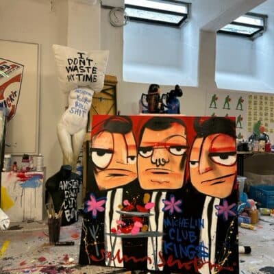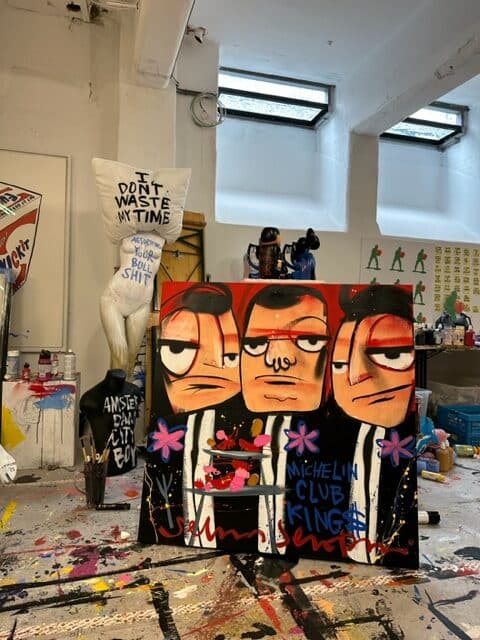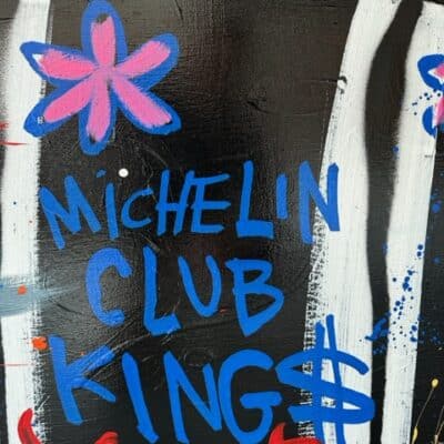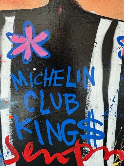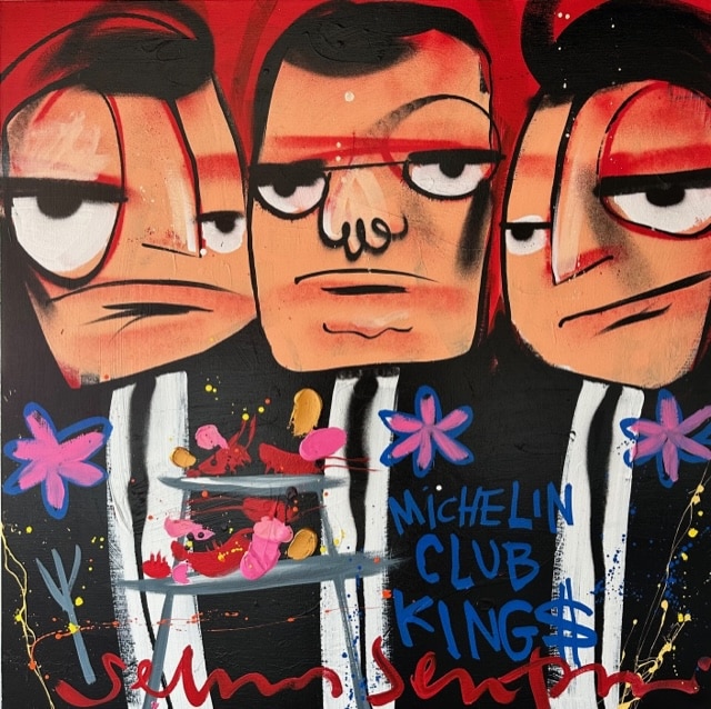 Origineel werk van Selwyn Senatori (2023) in prachtige kleuren. Het stuk is met gemengde technieken opgebouwd met een vlotte, vrije en trefzekere schilderstijl en het krachtige, dynamische kleurgebruik wat zo karakteristiek is voor Senatori’s werk. ‘Michelin Kings’ is vervaardigd op een dubbeldik opgespannen linnen doek waarvan de zijkanten door Selwyn zijn mee geschilderd.