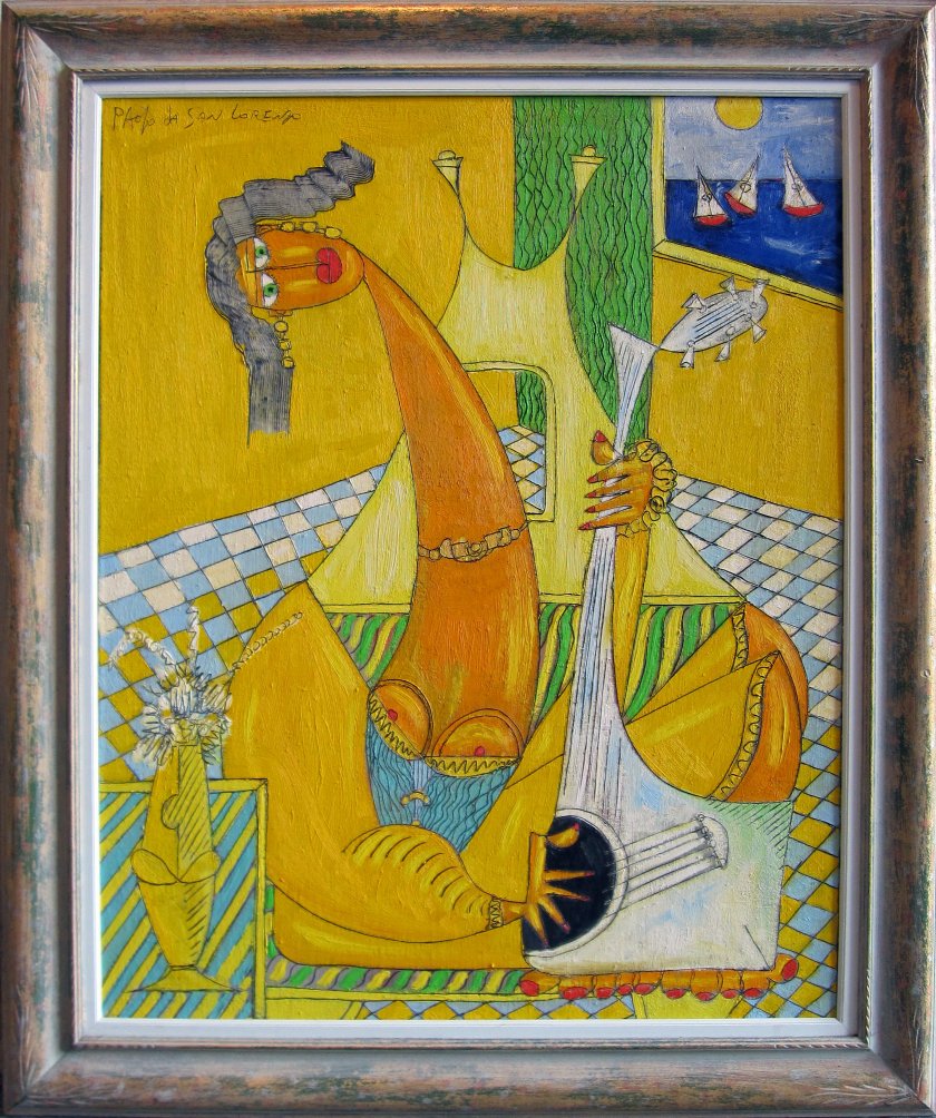 1 van een serie fraaie originele schilderijen van Paolo da San Lorenzo. De stukken zijn weer zonder uitzondering bijzonder mooi van kleur en figuratie en zijn door de kunstenaar op de voor hem zo kenmerkende wijze met dik olieverf op ruw canvas vervaardigd. De werken zijn op fraaie authentieke wijze door de vaste lijstenmaker van Paolo da San Lorenzo in Italië ingelijst.