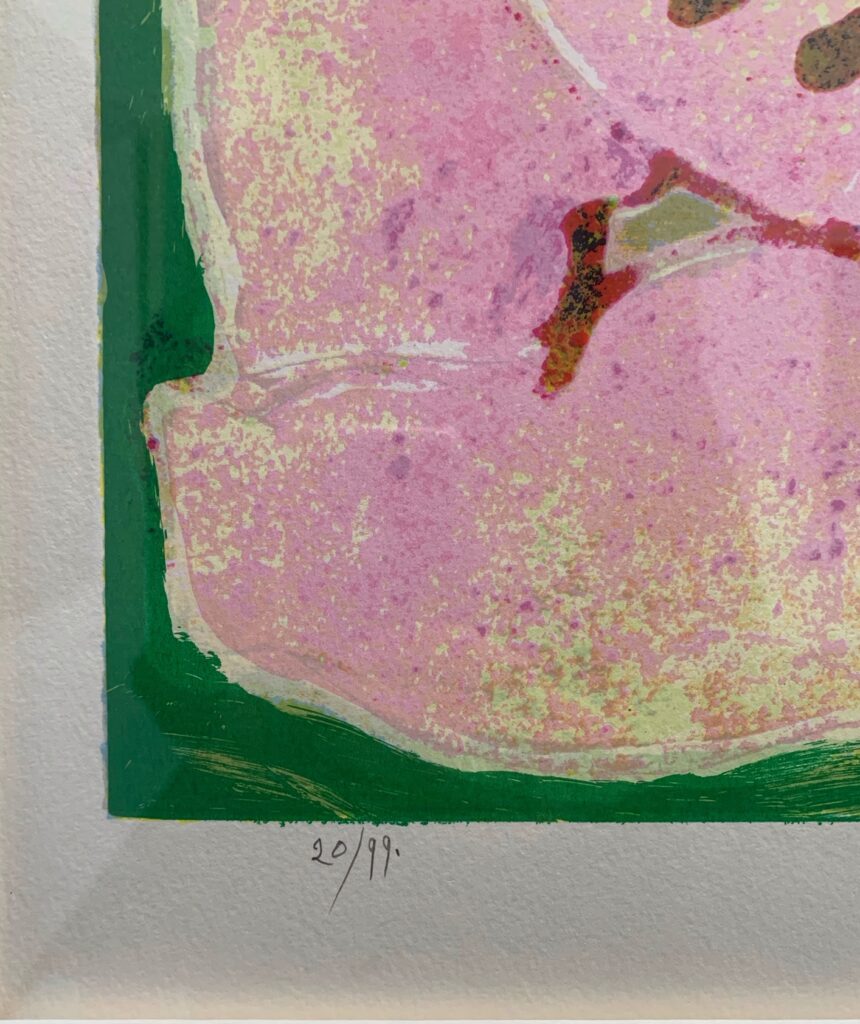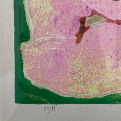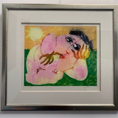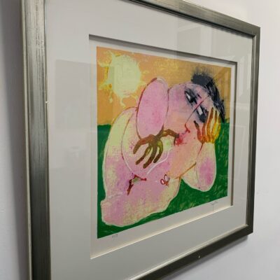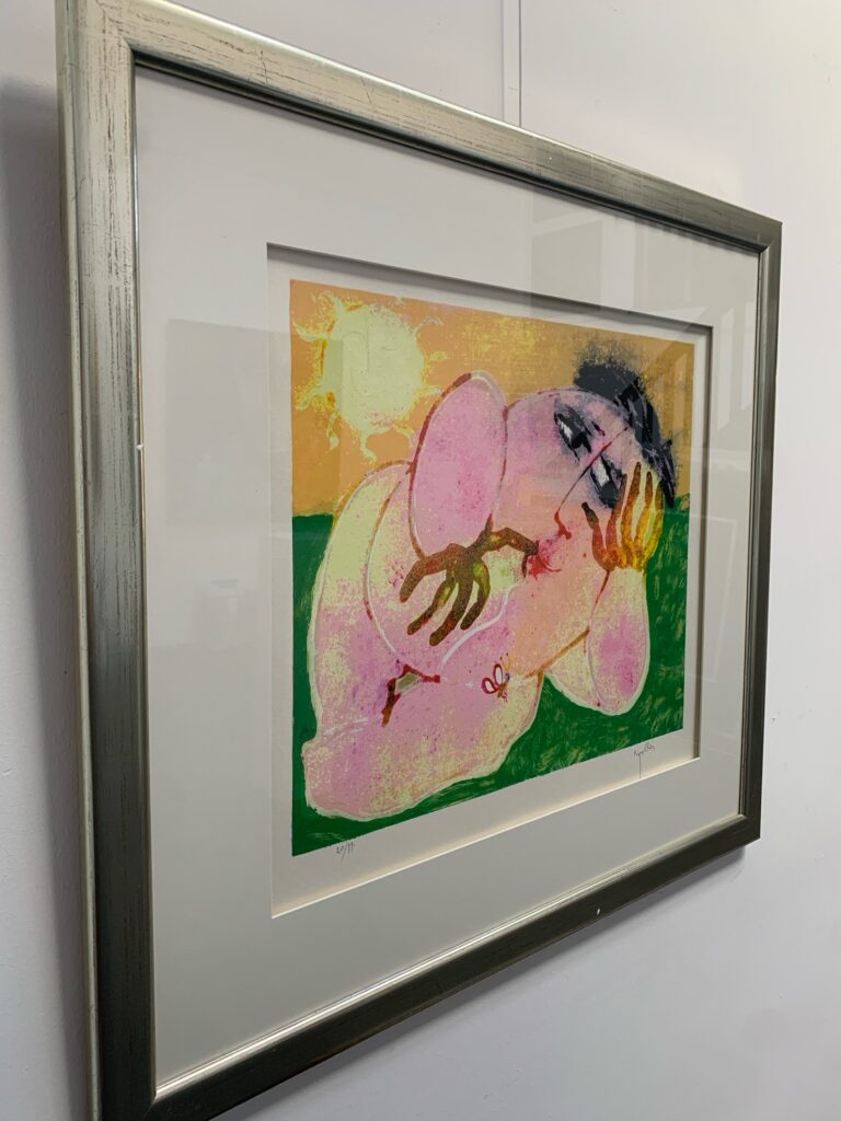Prachtige zeefdruk van de befaamde Spaanse kunstenaar Juan Ripollés. De kunstenaar heeft deze zeefdruk gelijktijdig vervaardigd met de “Pintor y modello” en de grotere “Mujer tumbada”. Ripollés heeft gebruikgemaakt van prachtig dik handgeschept papier en ook het kleurgebruik is zéér bijzonder. De stukken zijn ingelijst in mooie handgemaakte zilverkleurige lijsten, voorzien van bijpassende passe-partout accenten.