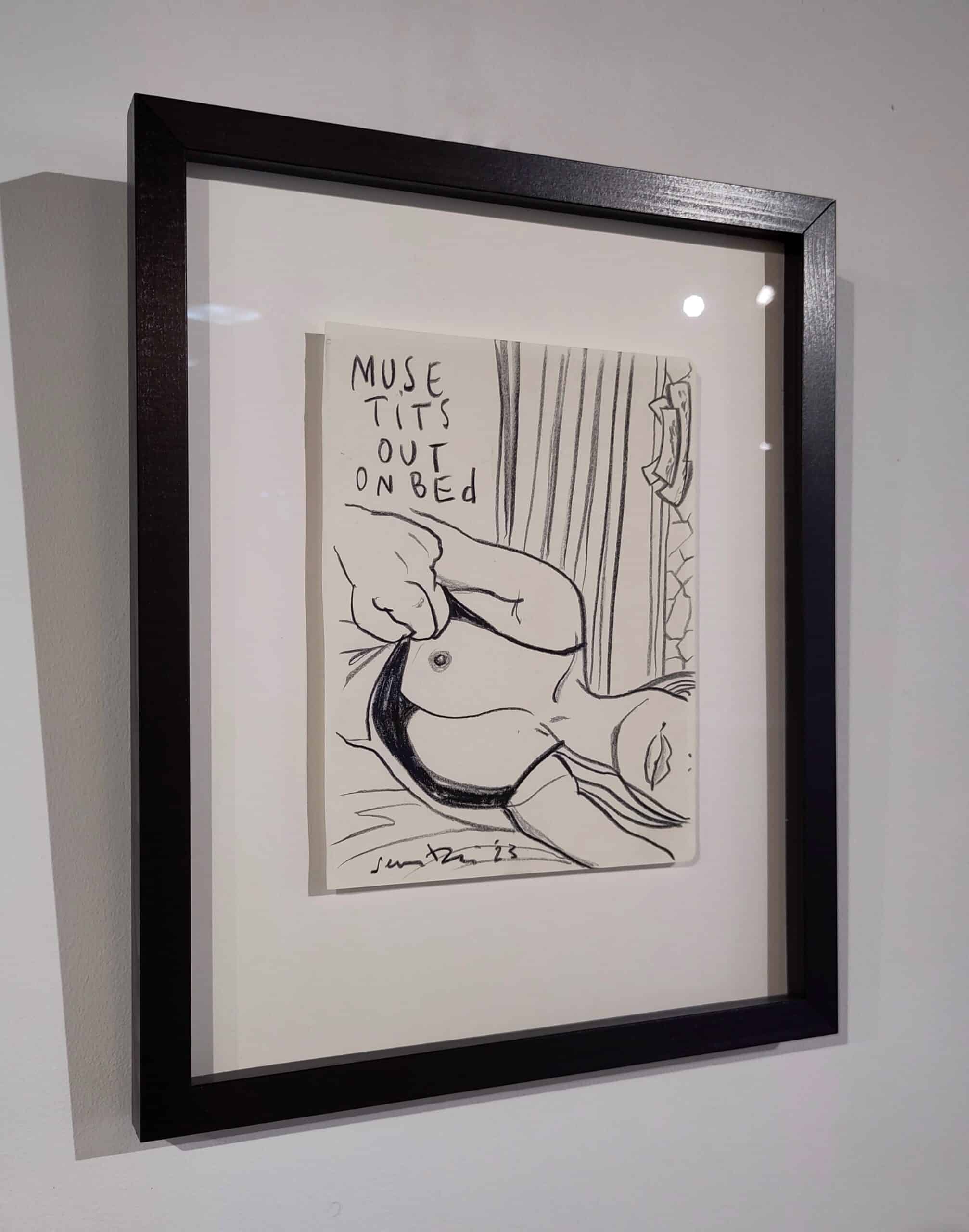 Originele schets op Moleskine papier uit 1 van de privé schetsboeken van Selwyn Senatori. Zwevend opgelegd in een handgemaakte zwarte houten lijst achter anti-reflectie en UV werend museum glas.