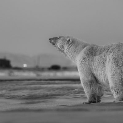 I have come to the safe conclusion that the Inuit elders from the coastal villages of the Beaufort Sea know all there is to know about polar bears. Their words are not words for “fast food” documentary television – they just say it as it is – it is their life. They respect the bears more than fear them and don’t just tolerate their presence – they admire their presence. The Inuit way of life is under just as much pressure as the polar bear way of life – after all, both are victims of our warming planet. I sense a solidarity born out of a common environmental enemy. The polar bears in these coastal communities are – in the main – not malnourished. Indeed, look at the size of this female – she must weight all of 1,200 pounds – seven times the average man. Her positioning just before sunrise was integral to the strength of the image and sunrise up there at Halloween time is around 9.30 am. These are short days.