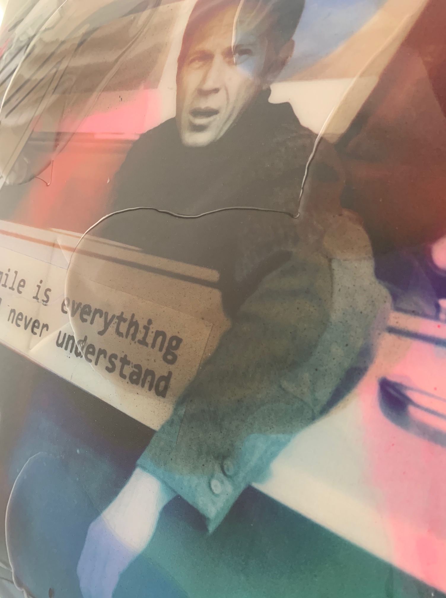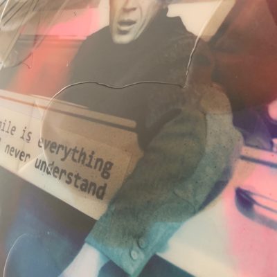 Mixed media monotype op linnen van de befaamde Duitse kunstenaar Jörg Döring. Het werk is door de kunstenaar opgebouwd uit fraaie heldere kleuren gecombineerd met foto’s, ruw geschilderde oppervlaktes, typografie en geschreven teksten. Afwerking met expoxy laag op linnen. De monotypes zijn in een volledig met de hand vervaardigde oplage vervaardigd waardoor elk stuk volledig uniek is.