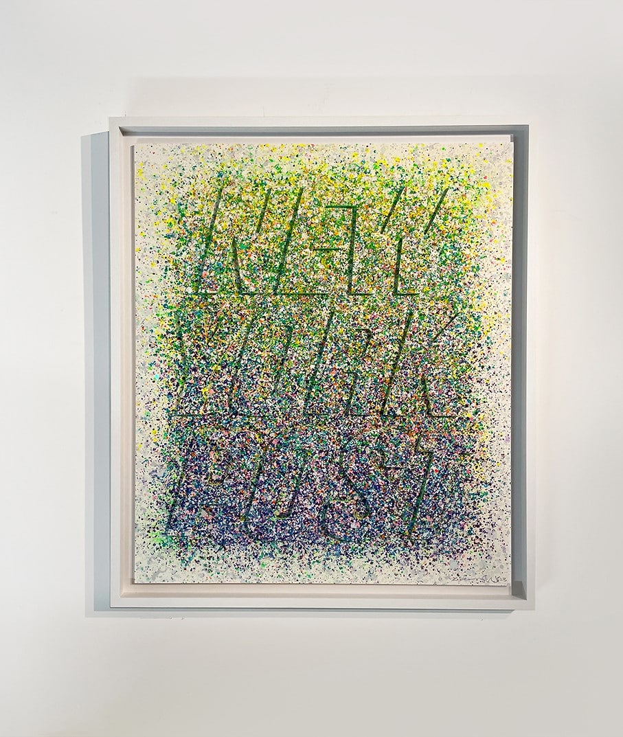 For his exhibition ‘Beyond Words’ Paco Raphael embarked on a journey exploring the limitless possibilities of typography as a standalone art form. The result is a visual symphony, where he orchestrated paint splashes and droplets into carefully crafted patterns. Each stroke and drop thoughtfully placed, giving life to a unique and mesmerizing fusion of colors and shapes. This innovative approach reimagines typography, offering an experience that transcends words.
