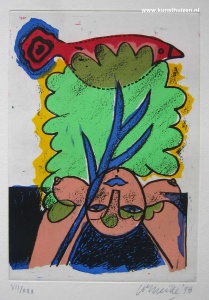 Bijzondere en zeer zeldzame kleuren-ets van Corneille uit 1998. Het werk is 1 van de 8 etsen die Corneille in 1998 vervaardigde voor de luxe verzamelmap “Femmes et oiseaux”, een prachtige katoenen verzamelcassette bestaande uit 8 etsen van Corneille en gedichten van Arthur Lundkvist (we hebben eventueel ook nog 1 volledige en complete cassette!). Etsen van Corneille zijn op zich zelf al zeldzaam en de zéér beperkte oplage van 60 stuks zorgt ervoor dat stukken uit deze map échte verzamelstukken zijn.. de etsen zijn ingelijst in mooie handgemaakte zilverkleurige lijsten voorzien van een zwevend passepartout.