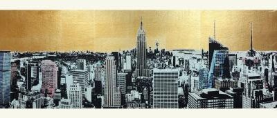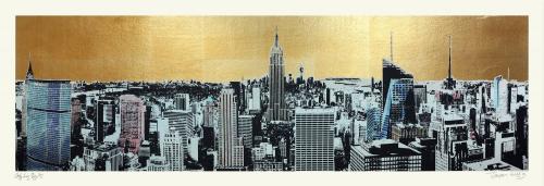 Het werk van de hedendaagse kunstenaar Jayson Lilley (1972) staat bekend om zijn stadse en architectonische focus, waarbij hij de nadruk legt op bekende stadsgezichten van onder andere New York. In deze zeefdruk biedt Lilley een spectaculair uitzicht op de skyline van Manhatten, met de East River, het Chrysler Building en het Empire State Building. Zijn unieke zeefdruktechniek wordt hier gecombineerd met met de hand aangebracht pen, inkt en bladgoud accenten.