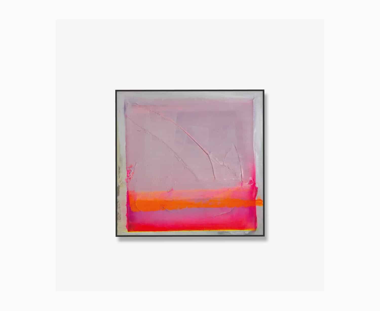 Mixed media, acrylic and pigment on canvas. Transparent layers of soft lilac, powder pink and a warm beige undertone blend harmoniously. Along the lower edge, a vivid band of orange and pink adds a lively accent that lifts the composition. The layered paint application creates gentle depth. A refined, contemporary painting that brings warmth and light.