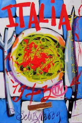 Origineel werk van Selwyn Senatori in prachtige kleuren. Het stuk is met gemengde technieken opgebouwd met een vlotte, vrije en trefzekere schilderstijl en het krachtige, dynamische kleurgebruik wat zo karakteristiek is voor Senatori’s werk. ‘Pasta Italia’ is vervaardigd op een dubbeldik opgespannen linnen doek waarvan de zijkanten door Selwyn zijn mee geschilderd.