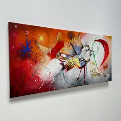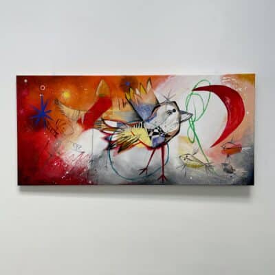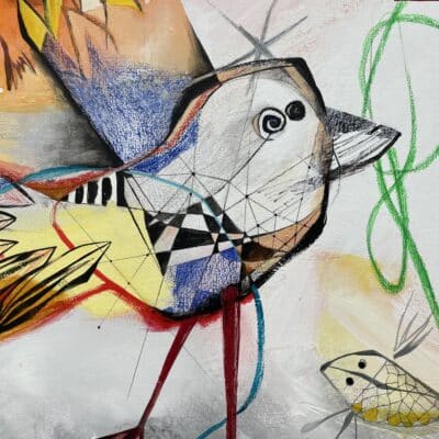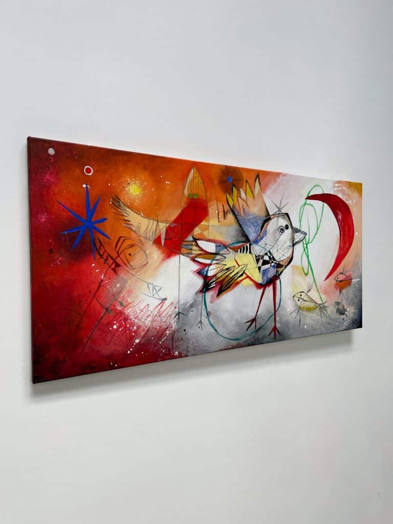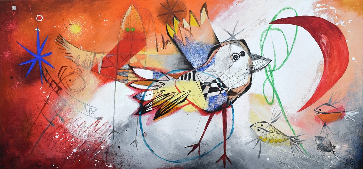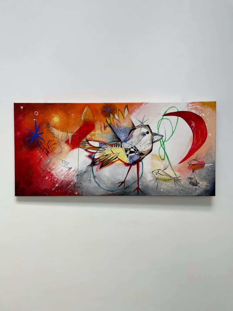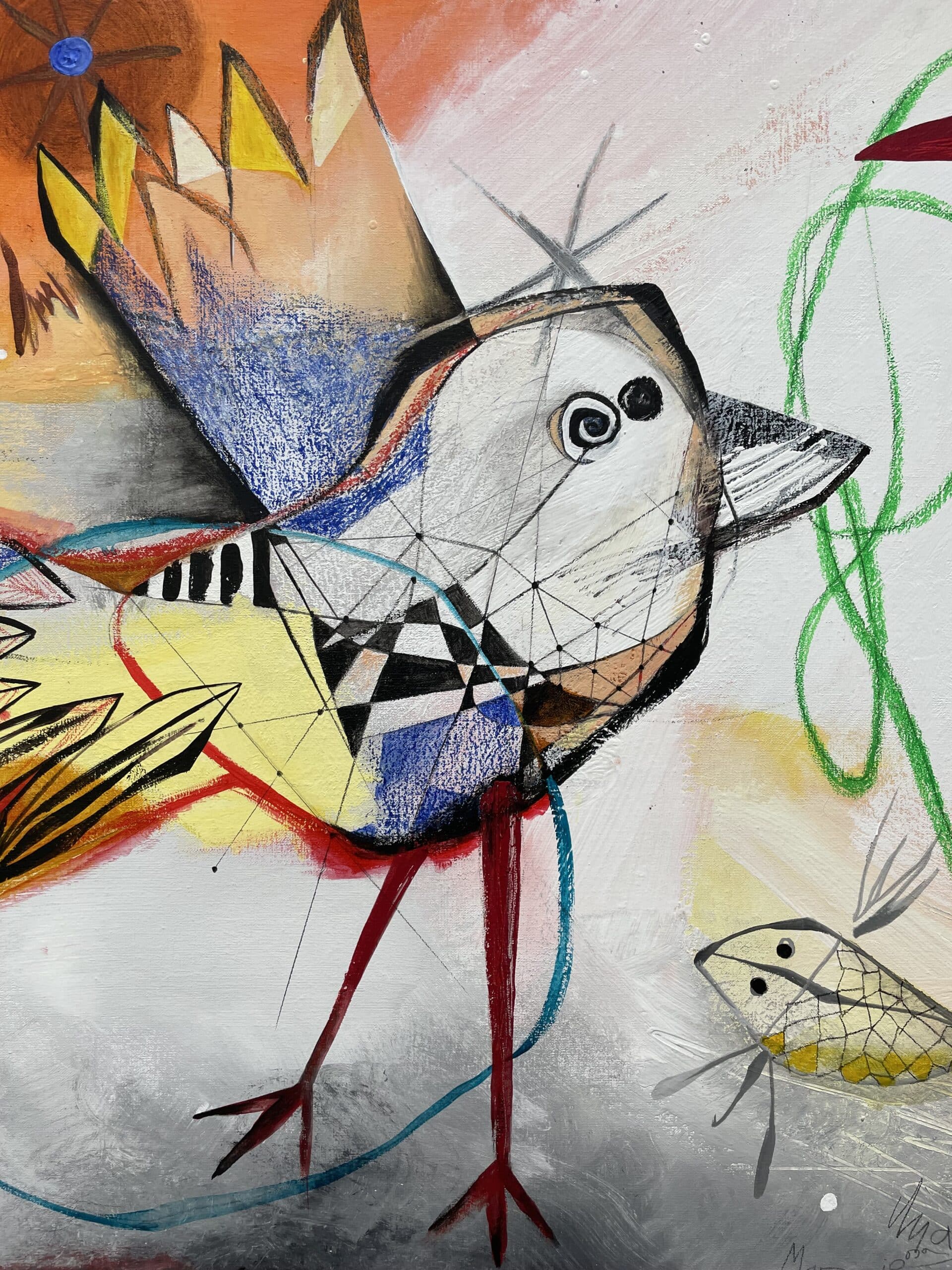 Origineel op canvas. Acryl, inkt en oliekrijt, 2023. “Pensamientos, tu nombre pájaro” = “Thoughts, your name bird”