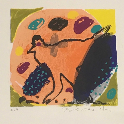 Zeefdruk op papier van de internationaal bekende kunstenaar Dominique Chan. De vrolijk stemmende aard van het werk van Chan is te danken aan het exuberante kleurgebruik en de driftige, spontane manier van tekenen en vlakvullen. Zijn composities zijn ongeremd, openhartig en staan bol van levenslust. Het nodigt uit tot ontdekken en ervaren.