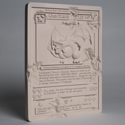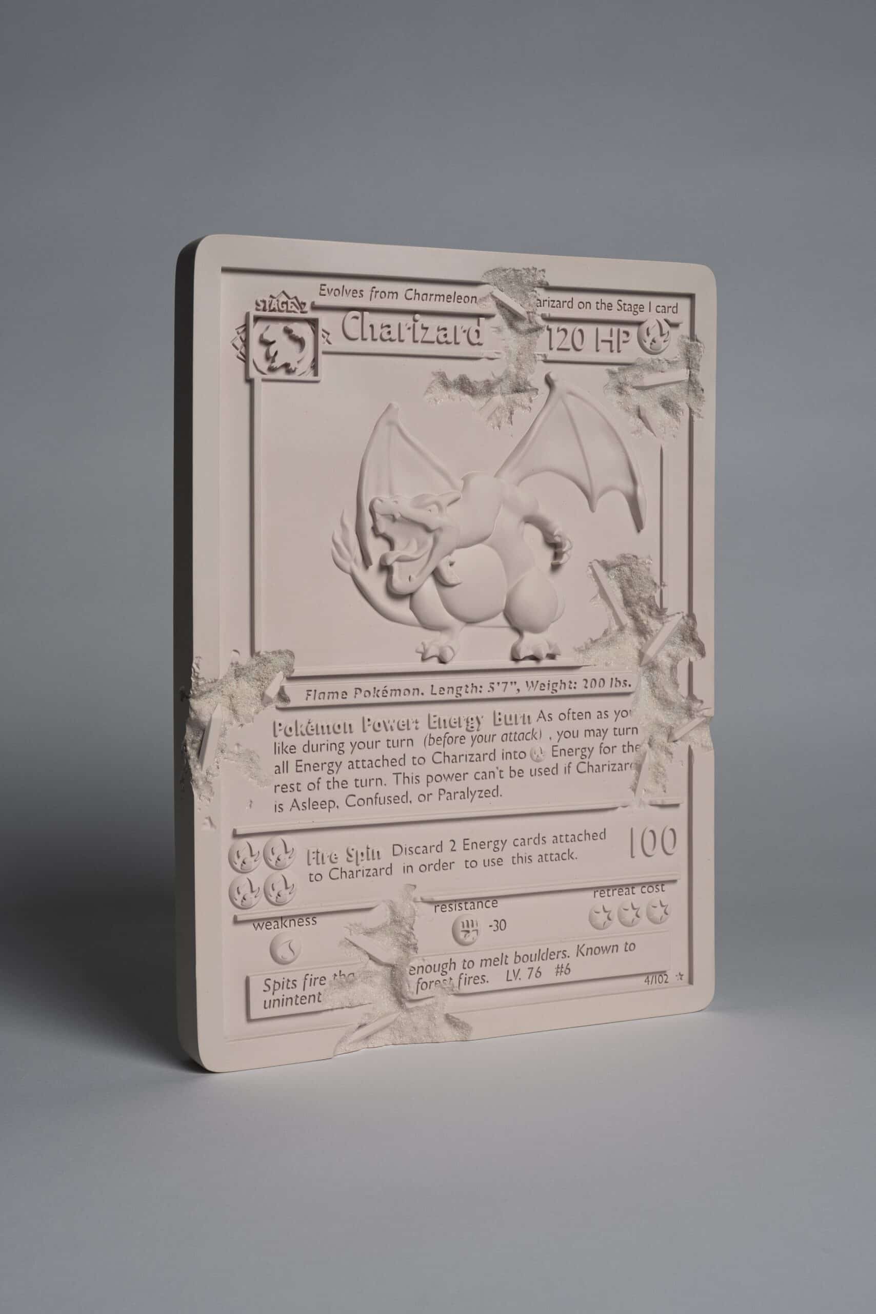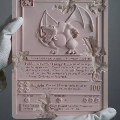 PINK CRYSTALIZED CHARIZARD CARD is a sculpture that has been reimagined as a monument of Kanto uncovered through the passage of time. This edition modeled after the 1st edition Charizard Holo is the most iconic in the Pokémon Trading Card Universe. This edition is made of pink cast resin and aluminum oxide, and is a scaled down version of larger work made in Arsham Studio. Each edition is 30.48 cm in length and weighs 2.4kg. PINK CRYSTALIZED CHARIZARD CARD comes in Arsham studio designed housing with die-cut foam, sealing label, and a pair of white art handling gloves. This is an edition of 500 pieces, and each PINK CRYSTALIZED CHARIZARD CARD includes an Arsham Editions holographic label verifying its edition number and authenticity.