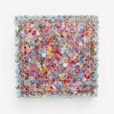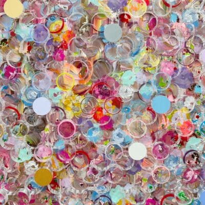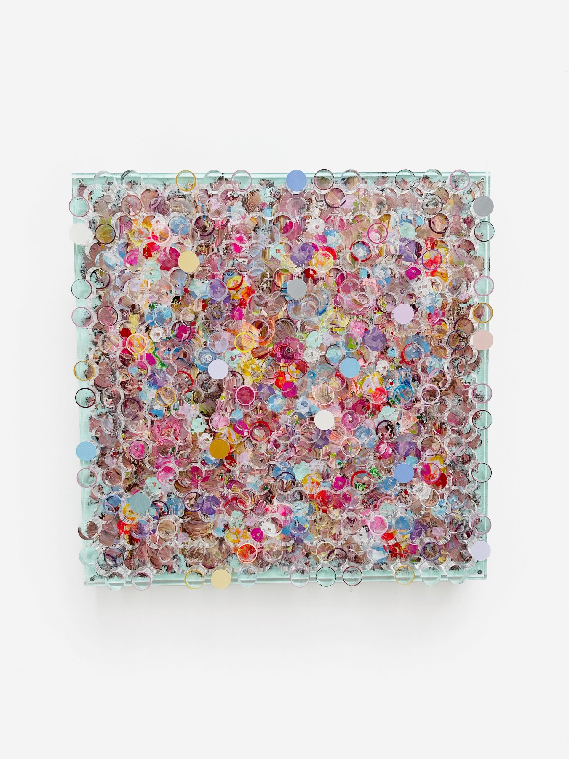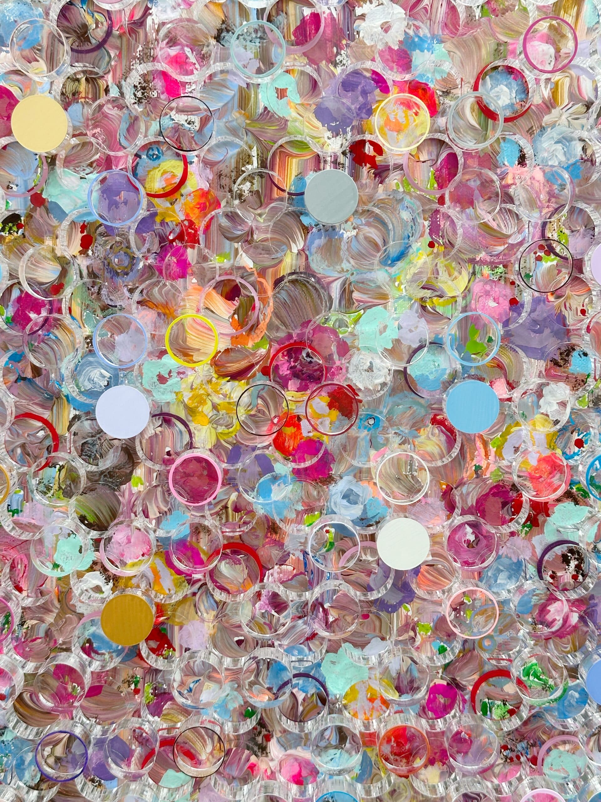 Ray of Light, Silvia Strobos. Acrylic on canvas, finished with a laser-cut plexiglass layer, with cut-out elements partly painted and reattached in relief. A rich palette of soft and vivid colors merges into a vibrant, almost luminous composition. The transparent circles create depth and a sparkling rhythm, giving the piece a warm and energetic presence.