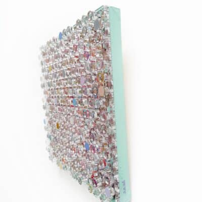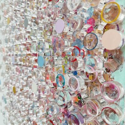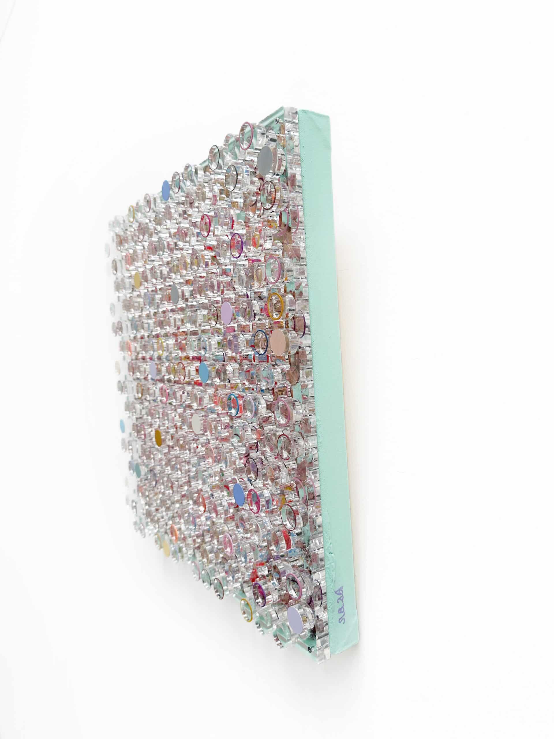 Ray of Light, Silvia Strobos. Acryl op doek, afgewerkt met een laser-gesneden plexiglas laag waarvan de uitgesneden elementen deels beschilderd en verhoogd zijn teruggeplaatst. Een rijk palet van zachte en heldere kleuren vloeit samen tot een levendig, bijna lichtgevend geheel. De transparante cirkels zorgen voor diepte en een sprankelend ritme, waardoor het werk een warme, energieke uitstraling krijgt.