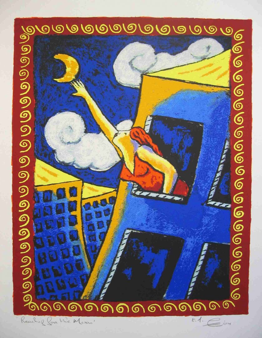 Zeer fraaie zeefdruk van Jacques Tange getiteld “Reaching for the moon””. De zeefdruk is geproduceerd in 2004. De kunstenaar heeft gebruik gemaakt van prachtig dikke drukgangen. De zeefdruk is in een zeer beperkte oplage gemaakt. Dit betreft zelfs een EA exemplaar”