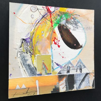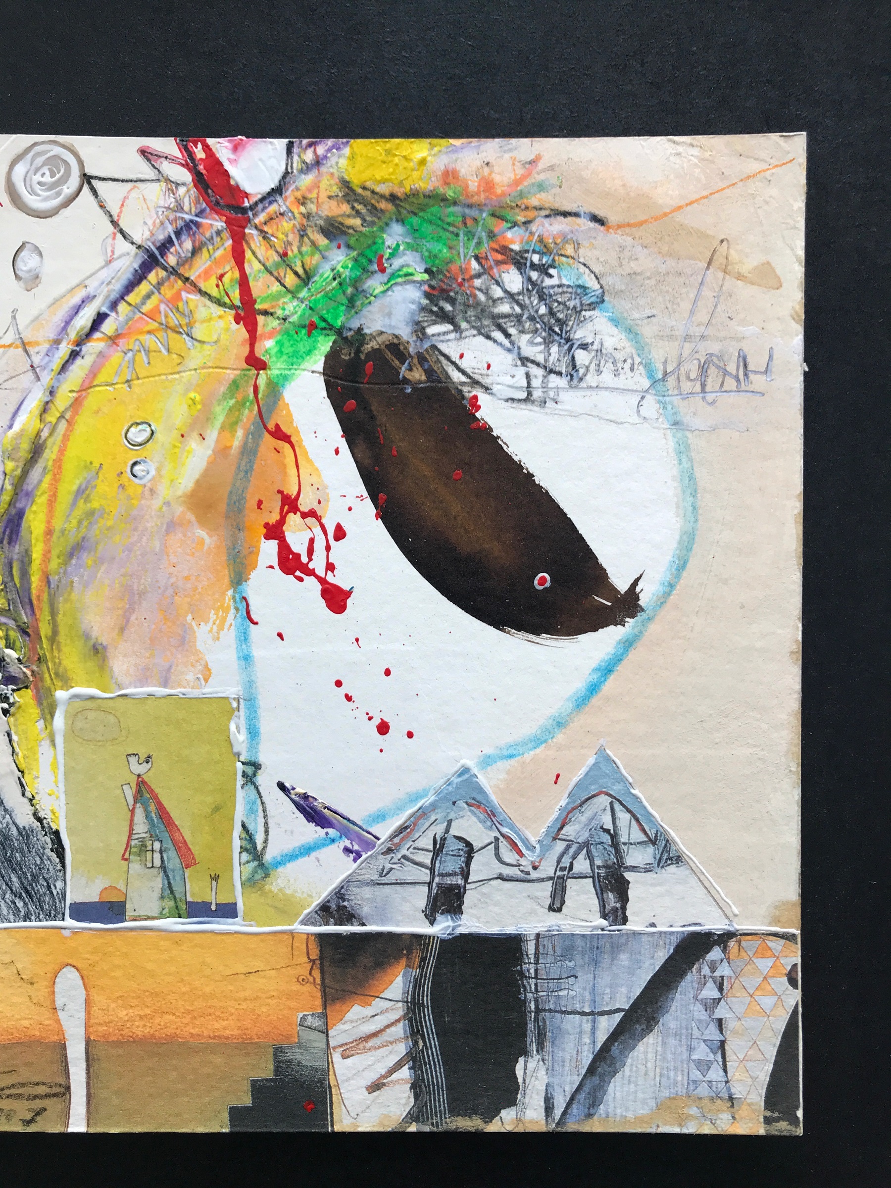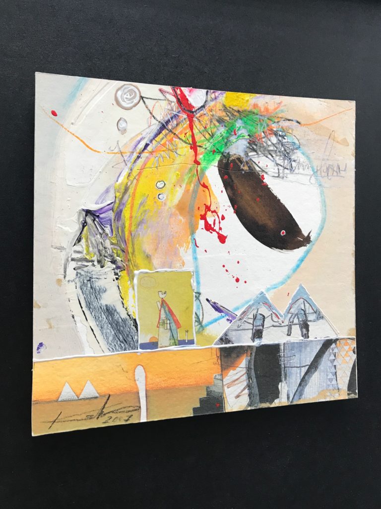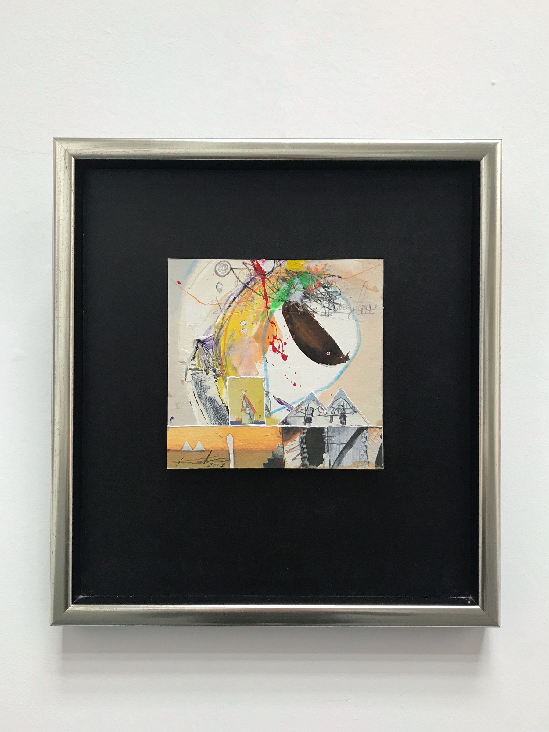 Origineel werk van Kantcho Kanev uit 2007. Het stuk is 1 van een serie prachtige kleinere werkjes op stevig kartonpapier die Kantcho vervaardigde in het voorjaar van 2007. De stukken zijn uitzonderlijk mooi verfijnd en gebruikmakend van uiteenlopende technieken opgebouwd. De werkjes zijn prachtig van kleur en als toeschouwer wordt je verrast door de vele kleine intrigerende details in de stukken! De schilderijtjes zijn opgelegd en fraai zwevend ingelijst in mooie bijpassende handgemaakte zilverkleurige baklijstjes.