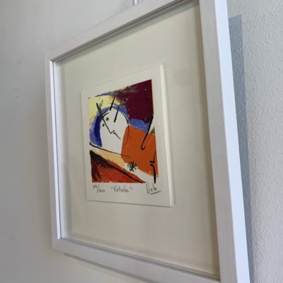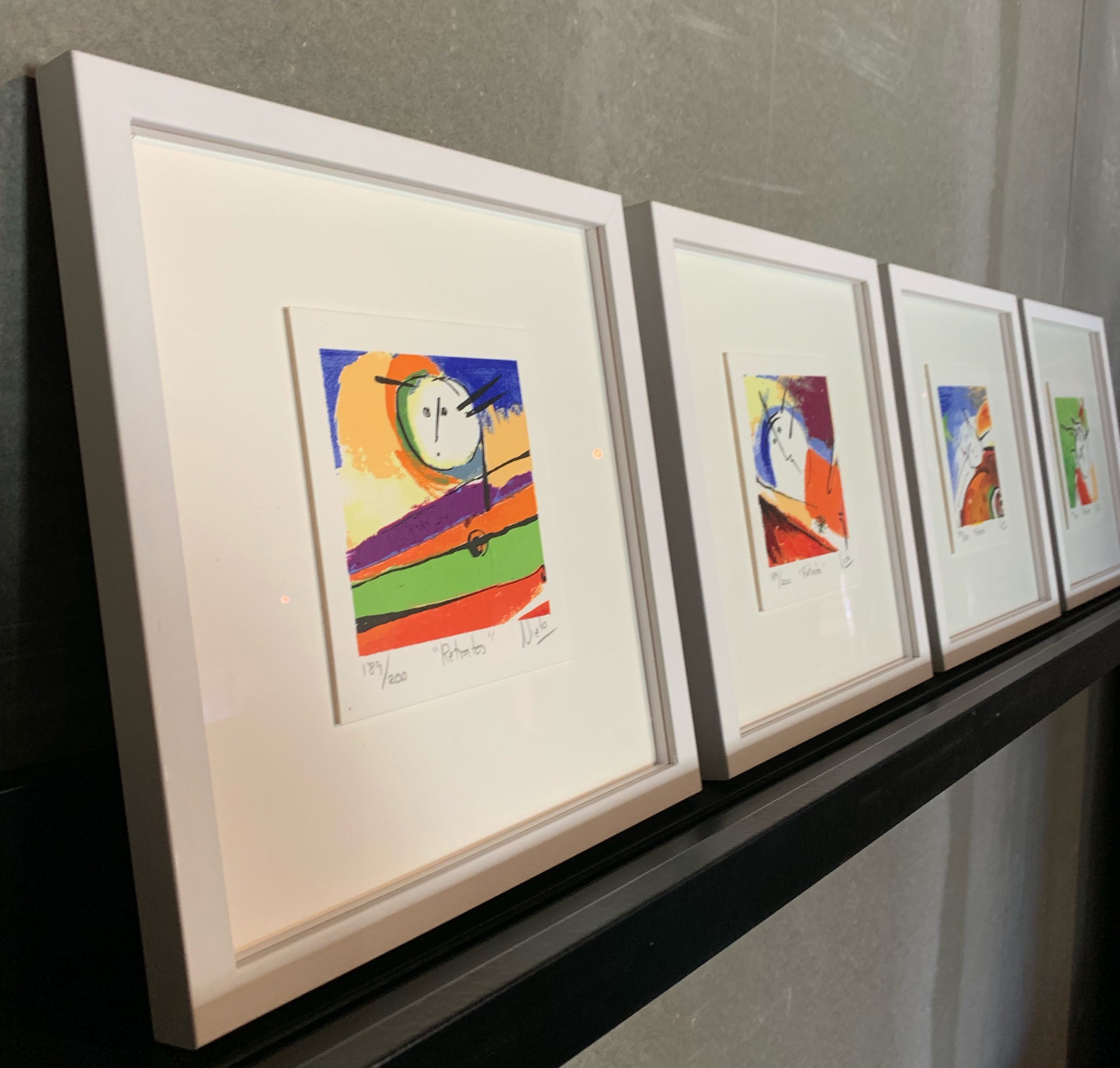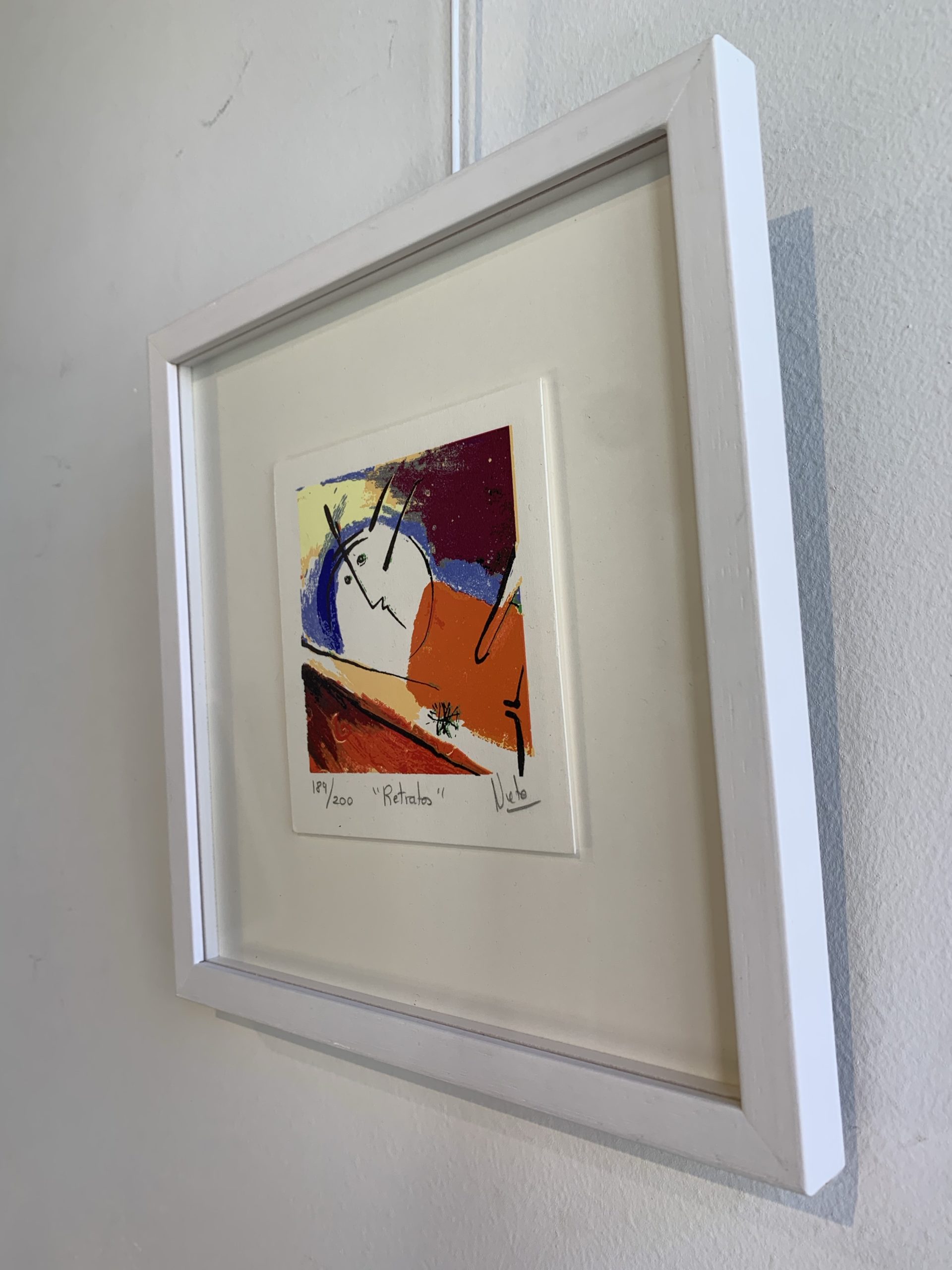 Kleine zeefdruk serie van Angeles Nieto getiteld “Retratos” (portretten). De serie is een 4-luik waarvan de afzonderlijke zeefdrukken natuurlijk los te combineren zijn. De zeefdrukken zijn in de lijst “zwevend” opgelegd, een heel erg fraai gezicht!