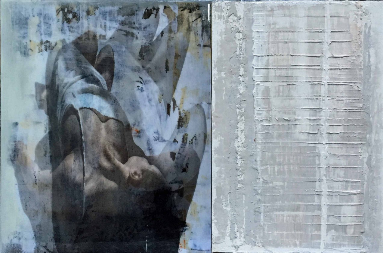Bijzonder fraai 2-luik van Robbert Fortgens uit 2014. Mixed media fotografie in combinatie met abstract olieverf op paneel: een samensmelting van de twee uitersten. De kunstenaar verbind beide disciplines, de fotografie en de schilderkunst, met elkaar door deze, al dan niet in of naast elkaar, in één werk samen te brengen.