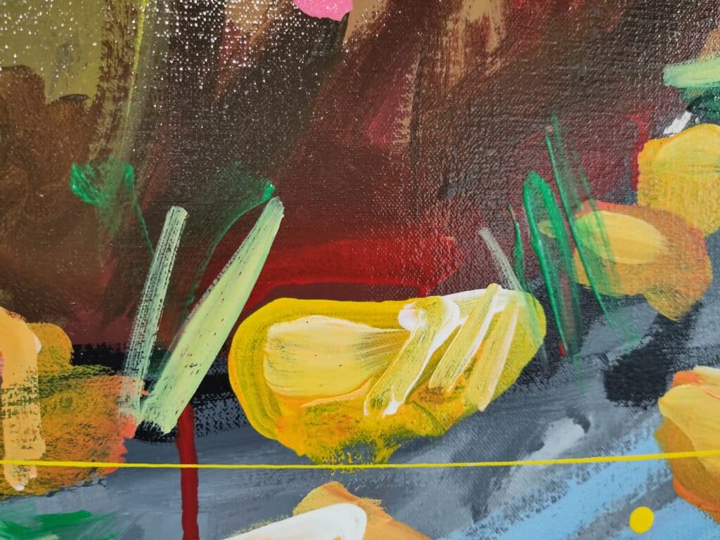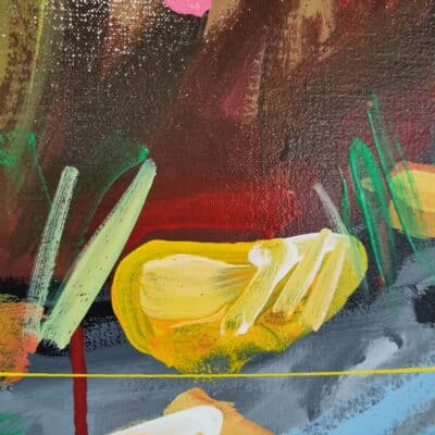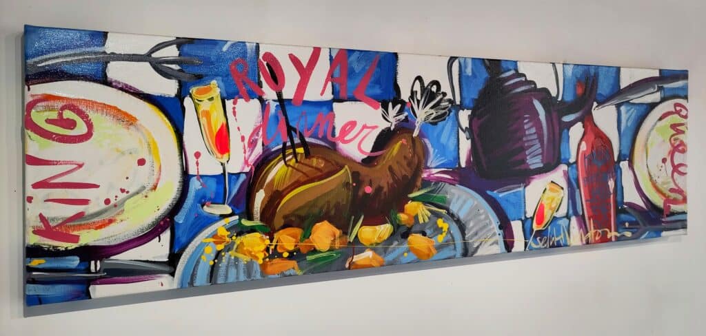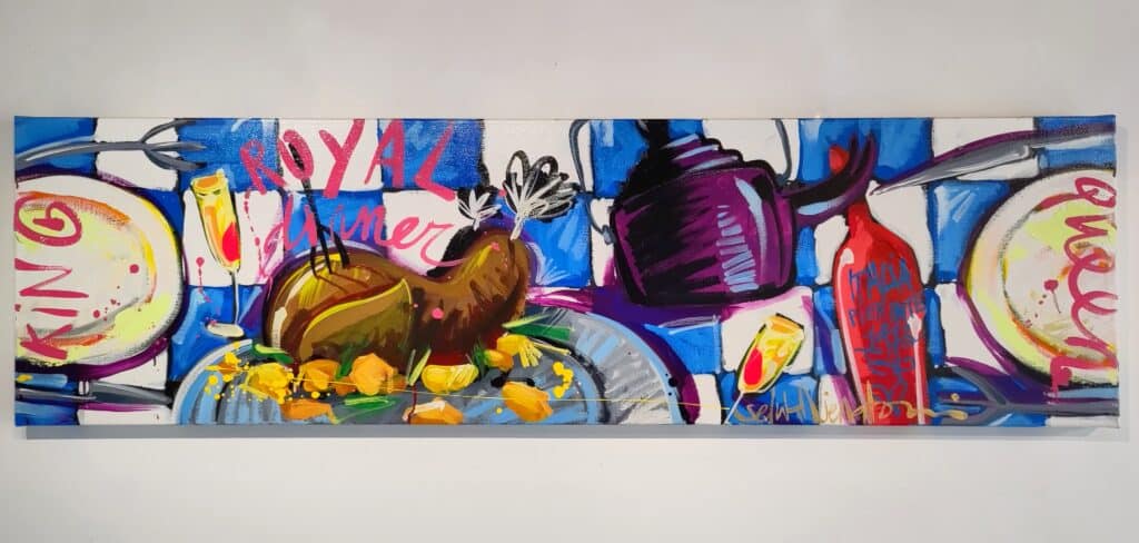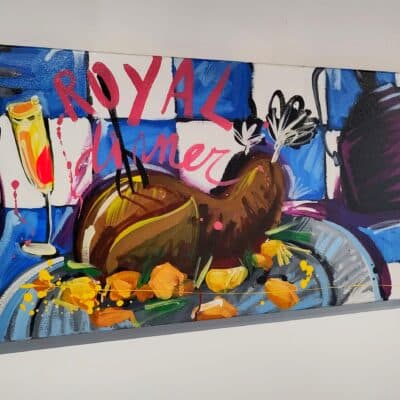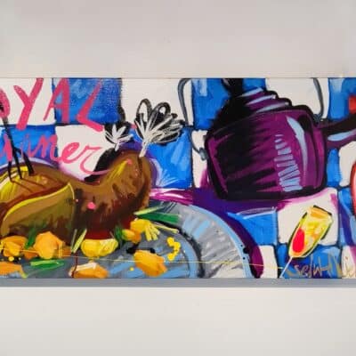 Origineel werk van Selwyn Senatori (2011) in prachtige kleuren. Het stuk is met gemengde technieken opgebouwd met een vlotte, vrije en trefzekere schilderstijl en het krachtige, dynamische kleurgebruik wat zo karakteristiek is voor Senatori’s werk. ‘Royal Dinner’ is vervaardigd op een dubbeldik opgespannen linnen doek waarvan de zijkanten door Selwyn zijn mee geschilderd.