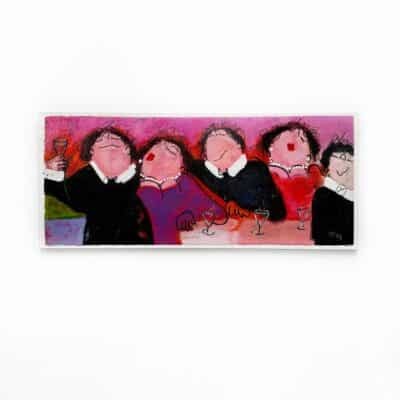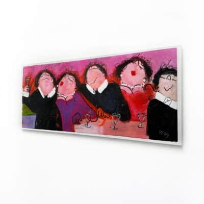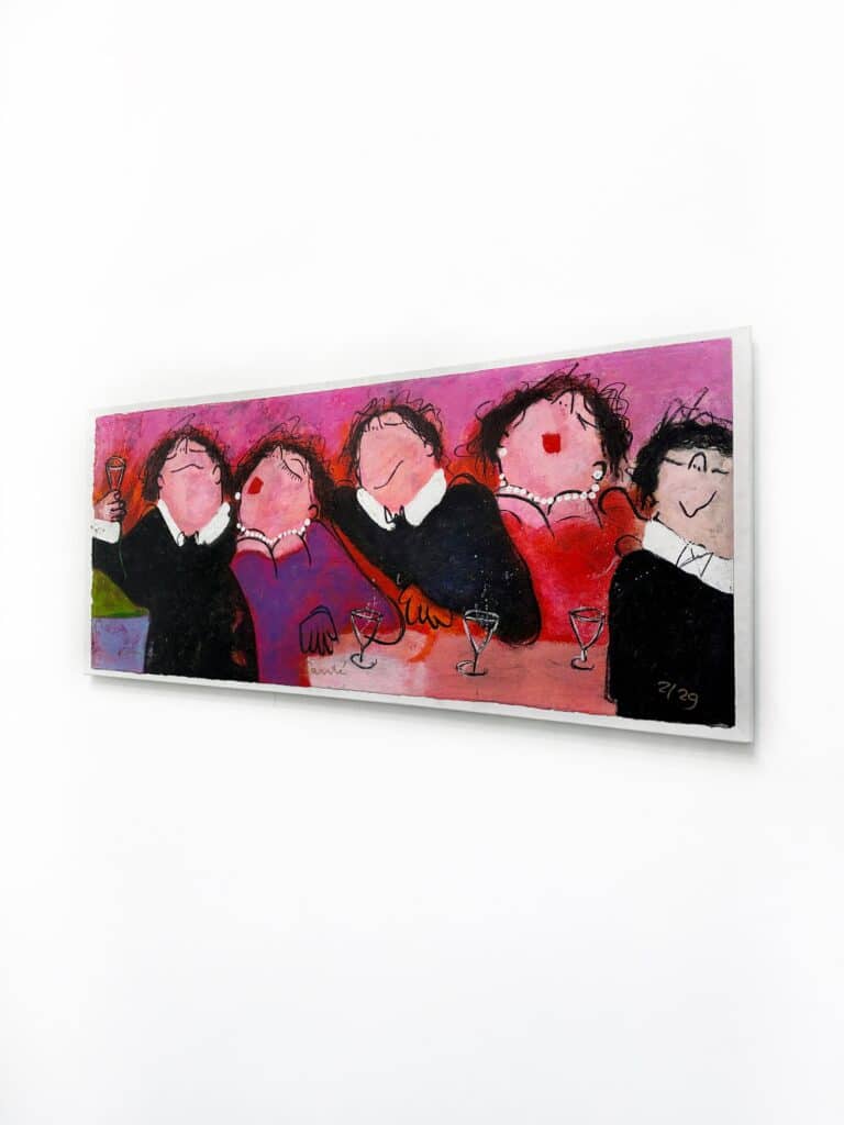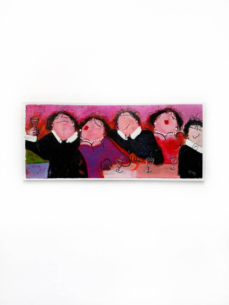 Een leuk monotype van de goedlachse kunstenares Gerdine Duijsens uit 2015. Het werk is op handgeschept papier vervaardigd, gebruikmakend van een mooie mix van technieken. Het resultaat is een vlotte, vrije maar trefzekere schilderstijl die in combinatie met de voor haar zo kenmerkende vrolijke figuratie zorgt voor de nodige glimlach bij de aanschouwer.