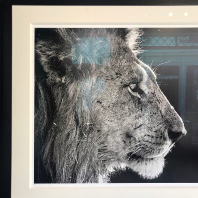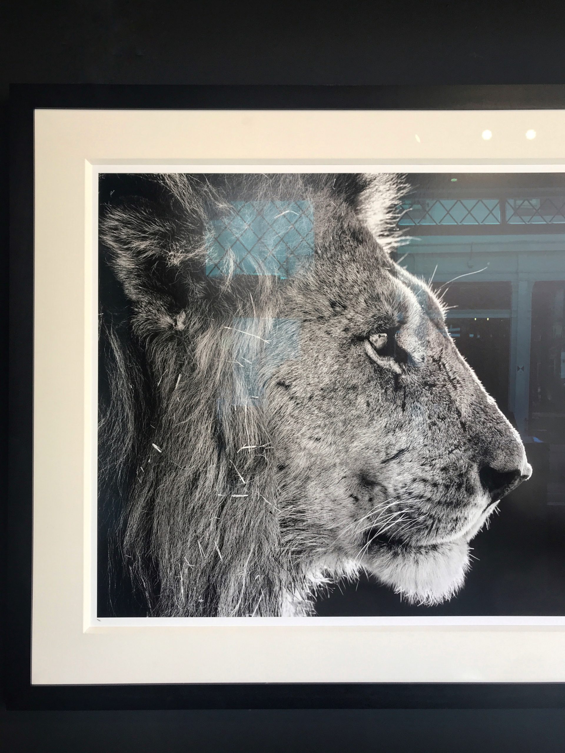 De foto is ingelijst in een zeer exclusieve handgemaakte zwart houten bloklijst voorzien van handgespannen katoenen passe-partout en museumglas.