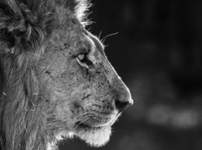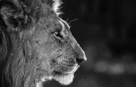 The Marsh Pride of Savute, Botswana are famous and revered hunters. The difficulty with lion photography in places such as Savute is simply the ability to work the camera into a position below the lion’s eye level. With longer lenses and greater magnification, the nasty effect of cameras angled downwards can be ameliorated. But we don’t like long lenses and if we can avoid them, we do. It tends not to offer the degree of emotion we are looking for.. . This profile shot has a transcending level of detail and crucially, because of a bank in the terrain, our jeep was able to get two feet below the lion’s territory. As a result, the lion’s eye is just a fraction higher than my eye, and I was able to get close, work against the light and play with detail. This profile shot has an intimacy and immersion that may hint at a degree of past experience in the field. By learning how to get it wrong, we eventually get it right.