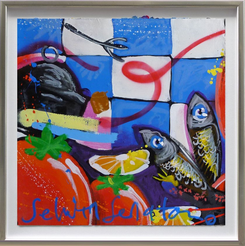 Tweeluik- zeefdruk van Selwyn Senatori uit 2013 op 1000(!) grams handgeschept papier. Selwyn heeft de zeefdrukken weer vervaardigd in de buitenlandse studio van 1 van Nederlands meest bekende meesterdrukkers. De stukken zijn van uitzonderlijke kwaliteit. De hoeveelheid drukgangen, gebruikte inkten en handmatig aangebrachte details zijn onovertroffen. Selwyn heeft tijdens de productie alle teksten met de hand op de stukken aangebracht waardoor er nog meer diepte en dynamiek in de stukken is ontstaan en niet 1 zeefdruk hetzelfde is.